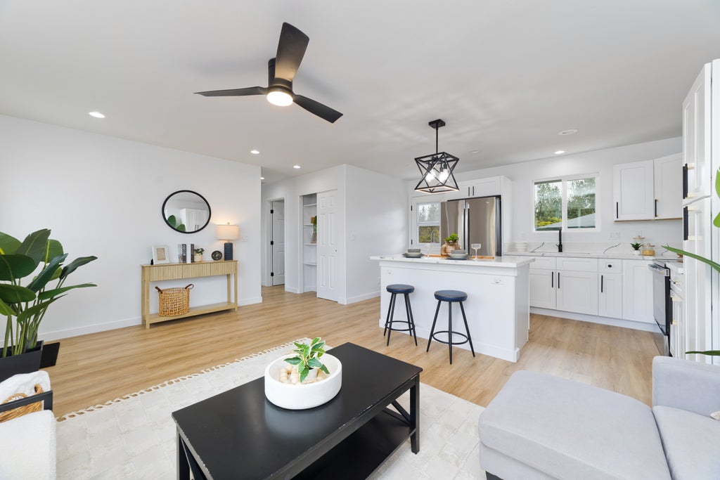 Step inside to an inviting open-concept living area and modern kitchen with stylish finishes throughout. Both bedrooms offer great space and ample closets, plus additional storage closets in the hallway. The sleek shared bathroom adds to the home’s thoughtful, on-trend design.