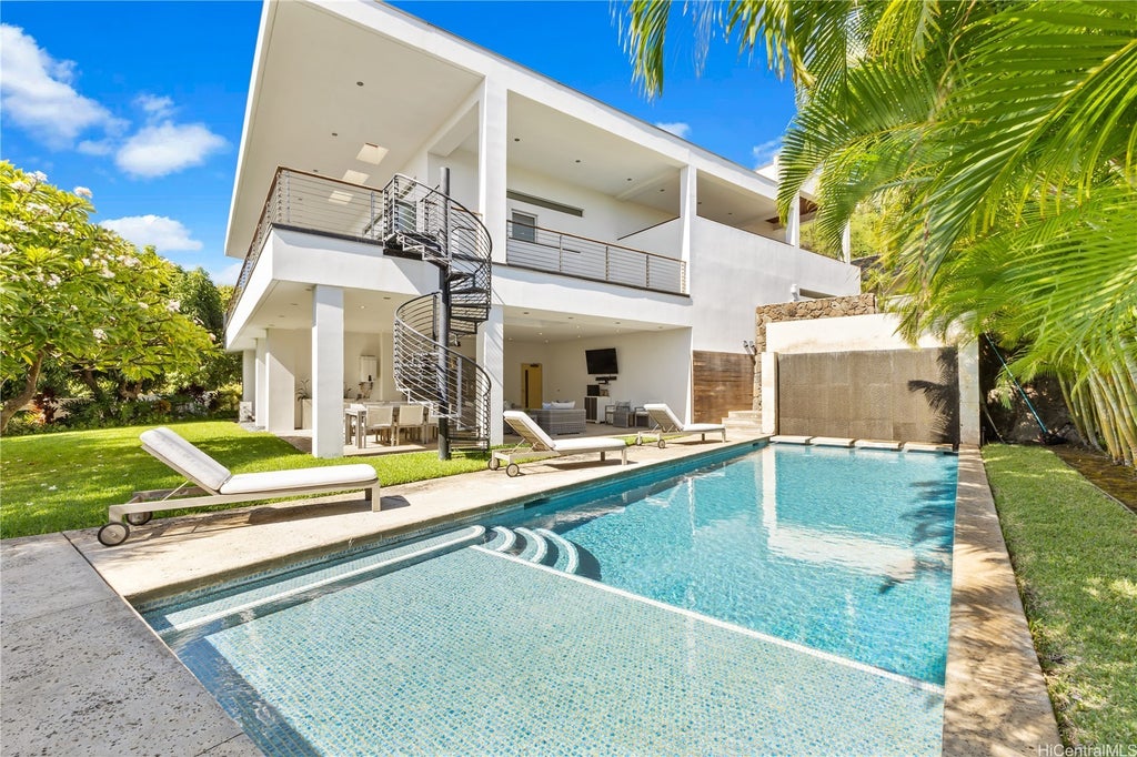 Custom built home in desirable lower Waialae Iki. 4 levels. Entrance area has high ceilings. The home is built to let in natural sunlight. Kitchen has top of the line Bosch appliance and a wine cooler. 1st level has a bedroom, 1/2 bath, 2 storage rooms, pantry and laundry room. 2nd level has your living room, dining room and large lanai that has a spiral staircase to the pool and large BBQ area great for entertaining. 3rd level has a family room, 2 bedrooms, each with their own full bathroom and an open den that leads to the primary bedroom that has 2 walk-in closets and its own private lanai. The lower floor (basement) has 1 bedroom, 1 full bath and a 1/2 bath and opens to its own lanai. Lower floor kitchen has a refrigerator, dishwasher and disposal (no range/oven). Split A/C in the 2nd level living room and dining room. 4 large covered parking. The private back yard has its own plumeria and avocado trees. Tree top ocean views.