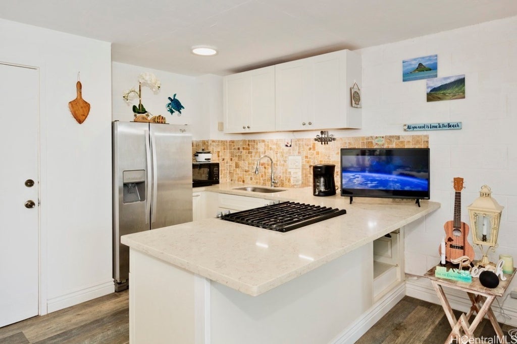 Discover the ultimate island lifestyle with this updated beachfront unit in Hauula. This one-bedroom, one-bathroom unit features an open and spacious layout, enhanced by the removal of the original partition. The kitchen has stainless steel appliances, granite countertops, and shaker-style cabinets, combining modern convenience with classic style. Wood-grain laminate flooring throughout ensures durability and easy maintenance. From your living room or the expansive private lanai, enjoy breathtaking ocean views, cool breezes, and stunning coastal scenery. The property offers great amenities, including a pool, direct beach access, a BBQ area, community laundry facilities, and secured entry. This oceanfront retreat is a rare chance to embrace the beauty and charm of Hawaii’s coastal living at an affordable price. Don’t miss your opportunity to own this slice of paradise!