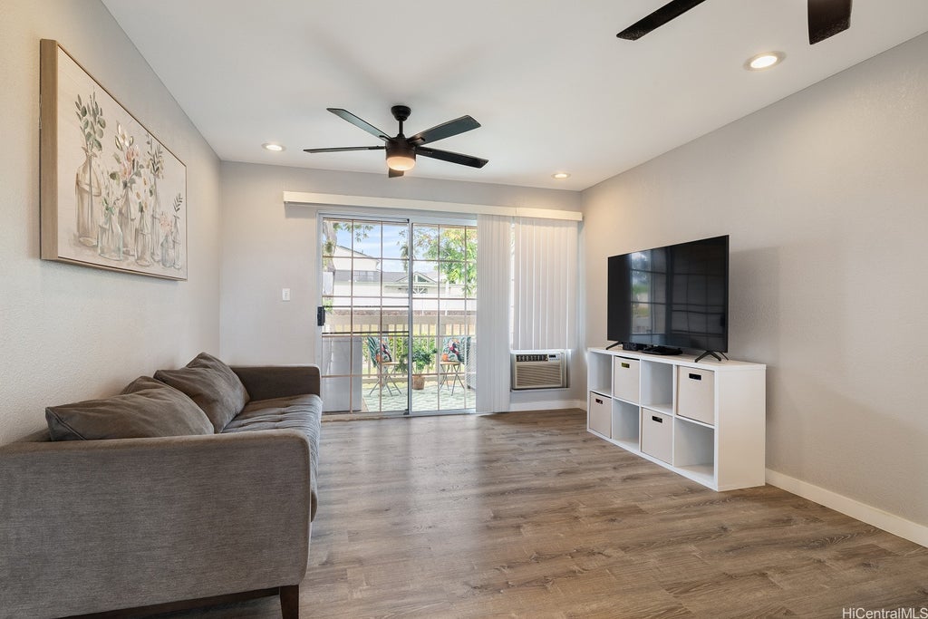 Fresh two-bedroom, two-bath upstairs townhouse in desirable Waipio Gentry. Features include luxury vinyl and ceramic tile flooring throughout, recessed lighting, brand-new ceiling fans, and a gourmet kitchen with an elegant peninsula, modern appliances, and custom cabinetry. The heart of the home features a spacious kitchen peninsula that comfortably seats 4–5 people—perfect for casual dining, morning coffee, or entertaining guests. This versatile space flows seamlessly into the living area, making it easy to cook, connect, and gather. Both bathrooms have been stylishly updated, and the popcorn ceilings have been removed for a modern, clean look. One assigned parking stall is included, with ample guest and street parking nearby. Conveniently located close to Waipio Shopping Center, Waikele Outlet Stores, dining, parks, and schools.