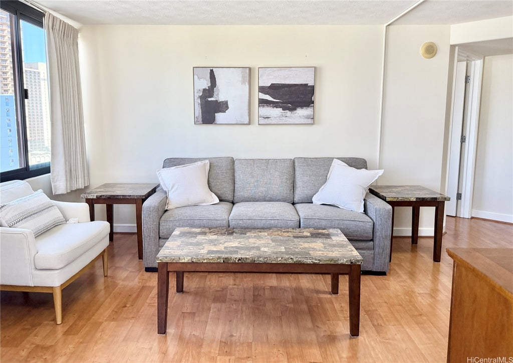 Windsor #1802 – 2-bedroom, 2-bath unit with 941 sq ft interior, located in a secure, gated high-rise in Waikiki, near Ala Moana. Fully furnished, featuring two en-suite bedrooms, a sofa bed, round dining table for four, Smart TV, Wi-Fi, and brand-new in-unit washer and dryer. One covered garage parking stall included. This unit does not have a lanai.