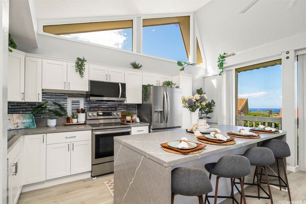 Discover this beautifully updated turnkey 2-bedroom, 1-bathroom home - perfect as a starter residence or investment opportunity. Ideally located at the base of the mountains with serene ocean views, this unit offers the best of island living. The home features a modern kitchen with elegant shaker soft-close cabinets, quartz countertops, and a waterfall-style island with ample seating, very high ceilings and 2 lanai's. Enjoy soaring high ceilings accented by a statement ceiling fan, and a light-filled living room with luxury vinyl plank flooring throughout. The stylish bathroom includes an LED mirror and contemporary finishes. Relax on either of the two lanais and take in the stunning views of the surrounding mountain range and ocean. Located just minutes from Makaha Beach, hiking trails, and local amenities, this home offers both tranquility and convenience. Don't miss your chance to own a slice of paradise — schedule a showing today! NEWLY PRICED with a motivated seller. This is a must see!