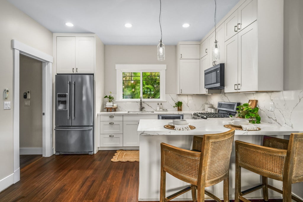 The existing residence is single-level and well-appointed, featuring hardwood flooring, solid quartz countertops, stainless steel appliances, vinyl-clad windows, and a Presidential roof. The recently repainted exterior in a clean, white coastal tone enhances curb appeal and blends beautifully with the tropical surroundings. With all infrastructure in place—including county water, sewer, and underground utilities—this is a move-in-ready property with inherent value and versatility.