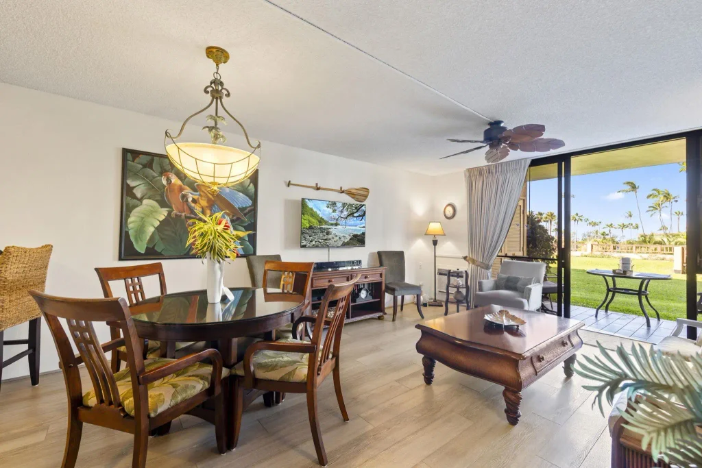 This 1 bedroom, 2 bathroom condo at Kamaole Sands has ground floor convenience, an inner court picturesque location with its garden and peek a boo ocean views, and all of the things that guests are looking for when booking a vacation rental. The condo is equipped with features including easy access to the pool and BBQ area's, luxury vinyl laminate flooring, cabinetry with quartz counters, stainless steel kitchen appliances, a well equipped kitchen, and a full sized washer and dryer. The condo is being sold furnished and is turnkey. Located just steps away from Kamaole Beach Park III and in building #5 at Kamaole Sands, makes this an ideal location. Resort amenities include a children’s wading pool, an adult and family hot tub, fitness room, ping pong table, gas BBQ area's throughout the resort, 3 pickle ball courts and 2 tennis courts. Kamaole Sands is an extremely popular resort as the condo is within walking distance to restaurants, shops, and a number of great beaches in South Kihei.
