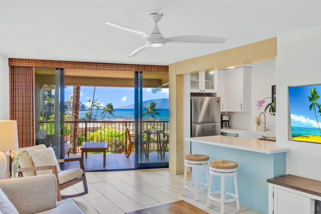 Welcome to Hale Ono Loa! A captivating view greets you the moment you walk in the door of unit 205 which underwent a complete renovation in 2021. The interior and lanai floors were upgraded with ceramic tile, and the kitchen and bathroom countertops were replaced with stunning quartz stone. The bathroom boasts a fully tiled walk-in shower with a glass door and a Japanese bidet. In the kitchen, new cabinets provide plenty of storage, complemented by a functional and stylish farmhouse sink. The space is finished off with stainless steel appliances and modern furnishings. A new floor to ceiling sliding glass door was recently installed. This condominium offers a variety of on-site amenities, including a pool, BBQ area, ocean view sundeck, shuffleboard, and storage for outdoor equipment like surfboards and kayaks, as well as laundry facilities. It is only steps from the ocean for easy access to watersports. Hale Ono Loa is located in the heart of Honokowai, West Maui, and is conveniently close to restaurants, shopping, golf courses, and the stunning beaches of the Westside. Monthly maintenance fees cover electricity, water, sewer, trash, cable, and internet. Offered turnkey with future guest reservations managed by My Perfect Stays.