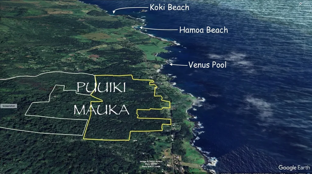 Located on the mild Southern side of Hana, just 4 miles from Hana town, close to the white-sands Hamoa Beach and Waioka (Venus) Pool... large & accessible Hana Highway frontages and reaching up to the Hana Forest Reserve which incorporates the undisturbed reaches of the remarkable, secluded wilderness of Waihoi Valley. Comfortable & reliable annual rainfall carried by gentle trade winds & conveniently distributed throughout the year... Pasturage along Hana Highway with large &, higher uphill, mature shade tree canopies spread above thin forest-floor foliage.... Waiohonu Stream, featuring large pools, runs along a substantial stretch of the east side, and Pukuilua Stream(intermittant) threads through the center of the Land, originating deep & high in the Waihoi Valley. A place of traditional agriculture, followed by sugar cultivation, and most recently cattle ranching...With diverse possibilities including mixed use agriculture, pasturage for livestock, tropical flower farms, fruit tree orchards, organic farming, forestry, hunting, & permaculture...Along with the potential for restoring native habitats and supporting conservation efforts, and more...A personal refuge for the Self-Reliant, enabling a truly sustainable & self-sufficient life style, yet Super convenient 15-minute drive to Hana Village's shops, PO, bank, restaurants, and mild Hana Bay's fine sand beach. Importantly, the land title of the lower 176 acres is officially registered with the Hawaii Land Court, providing the highest secure and reliable land investment advantage.