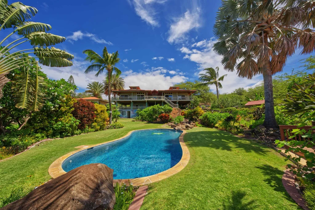 Family Compound on Molokai. Discover one of Molokai’s most Breathtaking Estate Homes, nestled in the exclusive Kawela Plantation. This private, tri-level family compound blends resort-style living with serene island beauty, featuring a very lush tropical garden setting, bamboo outdoor shower, cascading rock waterfall, and a custom gunite swimming pool with a covered gazebo—all framed by sweeping ocean views from Maui to Lanai and the golden hues of sunrises and sunset. The main residence showcases vaulted ceilings throughout and a stunning chef’s kitchen with granite countertops, rich wood cabinetry, and a dining area that opens to panoramic Pacific vistas. Step directly onto the expansive deck all along the whole front of house, where you'll find yourself gazing across the channel to the island of Lanai. The main level includes a spacious living room, dining area, an ocean-facing primary suite with a luxurious bath featuring glass block shower walls and walk-in closet, a guest bedroom & office, and a full hall bathroom. The second level offers a generous laundry room with toilet, and storage area with room for indoor/outdoor gear, with a large out door covered area to get out of the sun, while the third level includes multiple additional guest rooms and a versatile bunker space. A separate one-bedroom, one-bathroom Ohana guest house offers complete privacy with a full kitchen, tiled flooring, private lanai with ocean views, and an oversized two-car garage beneath—perfect for extended family, guests, or long term rental potential. Additional parking accommodation in front of property is great for those gatherings with ease. The surrounding grounds are a true garden oasis, fully fenced to keep out local deer and thoughtfully designed with a variety of fruit trees including avocado, papaya, banana, and array of citrus, plus vibrant vegetable gardens and all surrounded around a soft, manicured lawns. The front yard also features a shaded picnic area and an in-ground Imu pit, perfect for outdoor entertaining. Home has abundance of solar panel along with separate solar for the pool. As a part of Kawela Plantation, homeowners enjoy exclusive access to over 5,000 acres of shared land for private hiking, hunting, beach park, and recreational activities. This one-of-a-kind Molokai estate offers unparalleled privacy, natural beauty, and the peaceful island lifestyle you've been dreaming of. This is truly one of Molokai's best!!