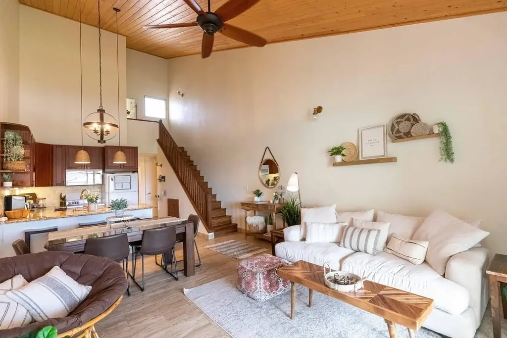 Hale maluhia ... Peaceful home. The theme for 311 is simplicity, ease of living, and desirable location. . This is a rare-to-the-market 2 bedroom, 2 story unit so you are rewarded with increased privacy and a feeling of spaciousness within the sky high natural wood ceilings. Stylishy refurnished and designed to be an elegnt beachy bright experience! Sleek gray wood finshed tile is laid from the kitchen through to the living room. Sold fully furnished with all the attractive extra touches and art. Beautifully contrasting immaculate green lawn onto blue ocean views from your tiled lanai. This perfectly angled lanai has a luxury leisure vibe to it. Classy and clean bathroom remodel and en suite washer/dryer. Literally just steps across the street to iconic Maui beaches and coastline walks. Several minutes to all of Wailea's luxury amenties ... world class golf courses, tennis, shopping and dining. Come see this uniquely welcoming home or investment space. Its a pleasure to show!