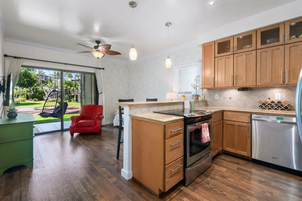 Discover your dream home at Pohailani in the sought-after Kahana neighborhood! This garden-level, fully remodeled 2-bedroom, 1-bathroom condo (renovated in 2022) is move-in ready, boasting a modern kitchen with updated appliances, a stylishly refreshed bathroom, and sleek new flooring throughout. Unit 152 is perfectly positioned near one of two sparkling community pools and BBQ areas, surrounded by lush, meticulously maintained landscaping and just steps from the oceanfront BBQ area with direct ocean access. Enjoy the serene, low-density community sprawled across over 8 acres, featuring a welcoming clubhouse and tranquil oceanfront seating areas. Nestled between the world-renowned resorts of Kaanapali and Kapalua, this prime location offers easy access to top-tier restaurants, shopping, a nearby gym, and public ocean access. The unit includes one assigned parking stall #10 right outside the unit, with additional unassigned and guest parking available. Each unit is attached to only one other unit. The AOAO fee includes water, internet, master insurance policy, landscaping, exterior building maintenance, and the common areas. The owner pays for electricity and a "wall's in" insurance policy. Embrace the Maui lifestyle in this exquisite condo where modern comfort meets tropical tranquility!