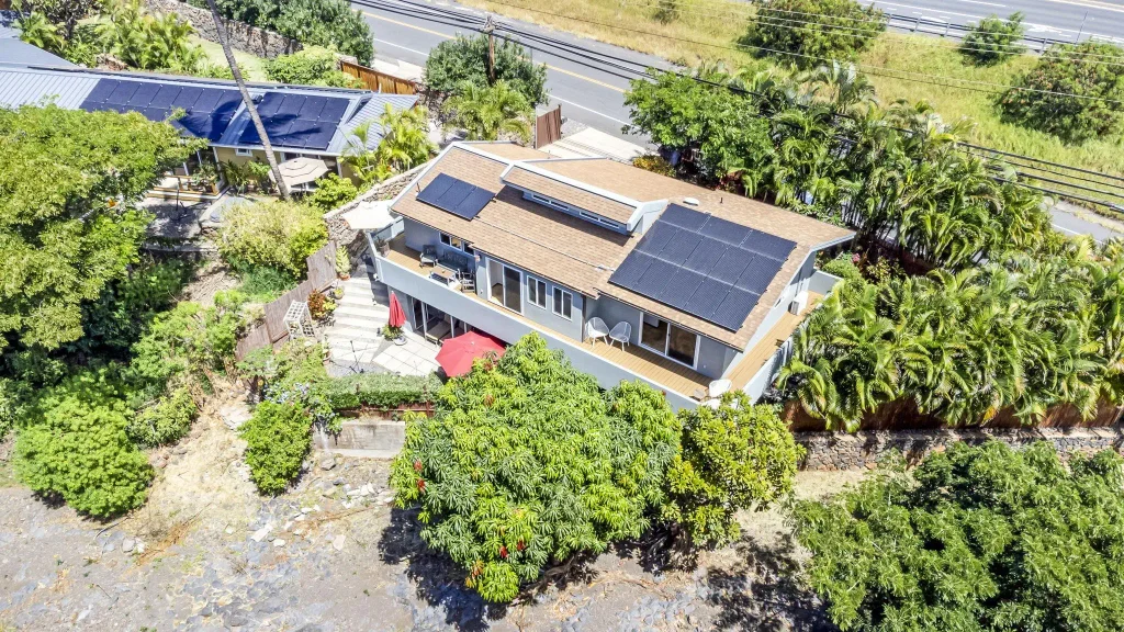 Shut the world out behind the gates of this renovated, solar-driven Keonekai Heights residence, a rare combination of interior elegance and lush outdoor space that envelops the property. Its footprint was crafted to create a multitude of living options, and to take full full advantage of two levels of lush and tranquil garden space. The exterior landscape and views are lush, varied and interesting, and embracing this magical property is as much about outdoor living as the indoor space. The tone is set by an expansive wraparound ocean view lanai off the main level. Or, change perspectives with and your view transforms, shifting elevation and panning the West Maui mountains. The exterior space affords its occupants a rare level of outdoor privacy in a true garden setting, blending myriad views and varied greenery to create a sanctuary uncommon to the likes of Kihei. Entering the home, you're on the top, main level, which is framed by Cathedral ceilings and hosts two of the three bedrooms and two baths. An open loft is perched, gallery-style, above the living space below. The Primary Suite was expanded and remodeled in 2013, enhanced with a dramatic en-suite bathroom with an oversized walk-in shower, dual-sink vanity, and custom cabinets. Its custom walk-in closet does not disappoint. This beautifully crafted suite accesses the extended wrap-around, ocean view lanai and meanders the expansive, 9278 square foot lot. The kitchen is contemporary and functional and blends granite and stainless within abundant dedicated space. A three-station split AC system effectively cool the space on command. Like the exterior, the interior was recently painted, adding to the prevailing light, open, and natural vibe. Another fully functional garden suite comprises the downstairs, which accesses the property's serene, natural setting and views off a pair of lanais. French doors open to a private gazebo area and a trickling water feature. The renovation continued downstairs, with a lovely new bathroom in place. A third private sleeping area (office?) has its own private entrance. This property's creative footprint is ideal for the extended family or for a private sanctuary for frequent visitors. NOTE: Interior photos show the property when it was occupied by the owners. Furnishings have been removed.