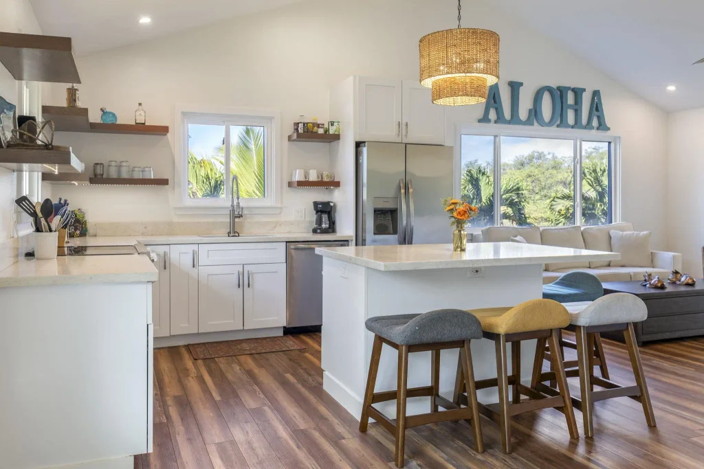 This beautifully remodeled single-level home sits on an oversized lot with room to add a pool, ohana, or detached cottage. The light and bright open-concept floor plan features high ceilings, new windows and doors, and seamless indoor-outdoor living through a sliding door to the expanded deck and covered lanai. Highlights include fully remodeled bathrooms with an expanded primary shower and double vanity, all-new cabinetry, countertops, appliances, recessed and under-cabinet lighting, plus fresh drywall and modern trim finishes throughout. Additional features and upgrades include a two-car carport with storage and laundry room, new irrigation system (4 active zones, pre-installed for 8), new retaining walls, landscaping, privacy fencing, and fresh interior/exterior paint. Conveniently located just blocks from Kukui Mall, Foodland, restaurants, and Maui’s best beaches and parks. Move-in ready with thoughtful upgrades throughout.