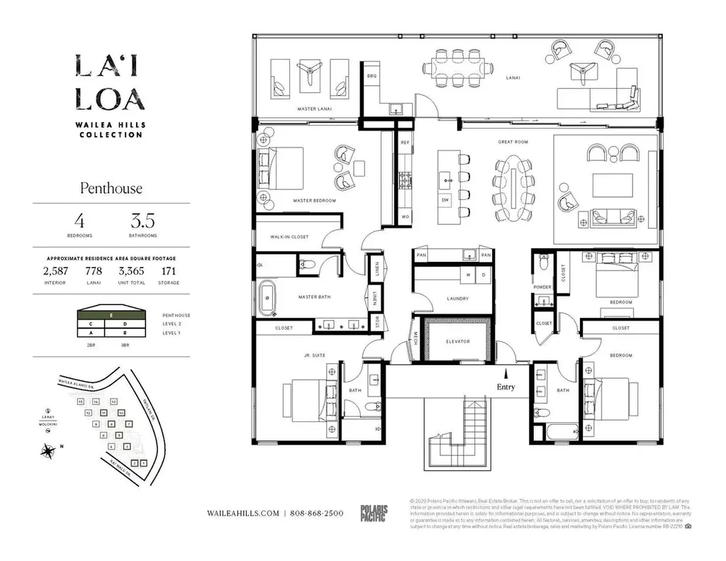 Island Allure from a Captivating New Vantage Gently commanding the top floor of the villa building, the sublime penthouse residence offers approximately 2,587 square feet of modern living space and truly unsurpassed ocean vistas. Uncover true luxury in Wailea with this four bedroom home in the sky, dazzling with an open floor plan, junior suite, and full master suite with private lanai. A grand sliding window wall connects the great room to an expansive lanai of approximately 778 square feet complete with an exterior wet bar and built-in BBQ, ideal for unforgettable sunset dinners with friends and family. The entire western (makai) portion of the penthouse floor plan is occupied by the expansive great room and the master suite, each connected to the lanai outside by the home’s defining feature: a sliding window wall. A beautifully open and unobstructed layout removes boundaries between the kitchen, dining and living areas for a light and inspiring atmosphere punctuated by refreshing trade win breezes and expansive ocean views. In addition to the expansive master suite, a junior suite with en-suite and two additional bedrooms mean you will never be short of room. With the optional three bedroom plus den configuration, the home would feature the master suite plus two junior suites and a den that flows directly in to the great room. Serenity comes in a timeless palette of warm wood tones, crisp white and cool grays in the spacious five-piece bathrooms of this penthouse residence of La’i Loa, featuring a free standing bathtub and a walk-in shower. Guest baths offer top-quality sink and shower fixtures with a sleek design. Pictures used are developers renderings and not unit specific. Information is deemed to be reliable but not guaranteed.