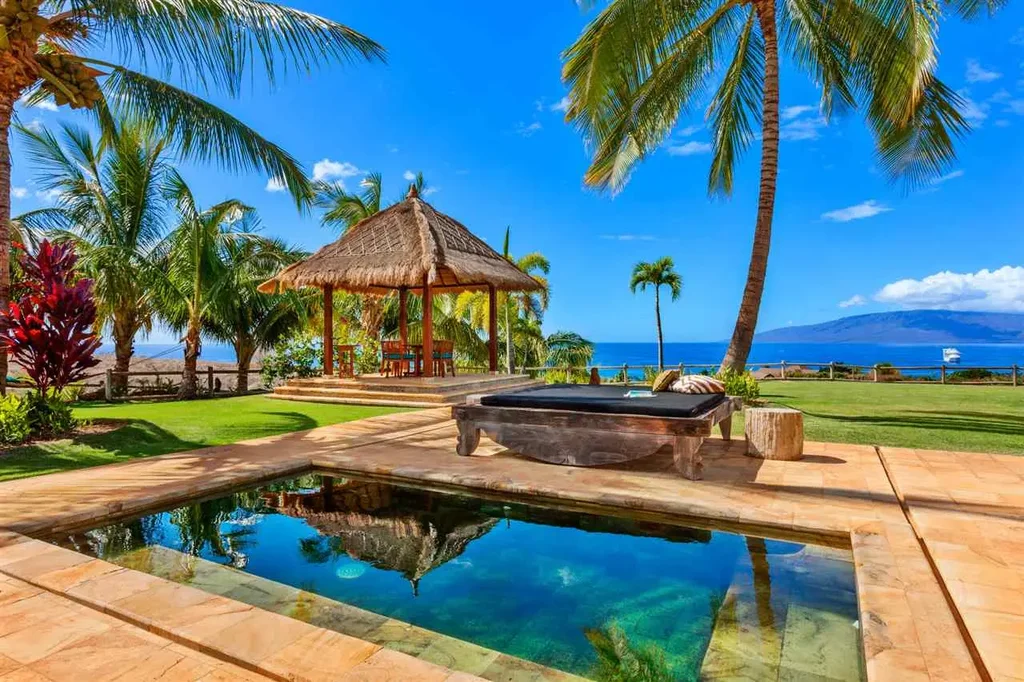 Located in the premier gated community of Pu'unoa Estates, overlooking Lahaina, 56 Wili Okai features 6 acres of expansive ocean, island, and sunset views in the perfect climate of West Maui. It is one of 24 exclusive estate properties with a 5-acre minimum size, zoned to permit a main house of any size, as well as a guest cottage of 1000 sq ft, and a barn. The perfect location to build your dream estate. This exotic Bali-style retreat exudes tropical island living. With pocket doors opening from the great room to over 2,700 square feet of spacious covered lanais, seamless indoor-outdoor living and entertaining can be experienced all year round. Enjoy views of Lanai and Molokai, West Maui mountains, year-round sunsets, and whale watching from this luxury villa and its pool, outdoor shower, and gardens. Details include finishes and furnishings from Java and Bali, custom cabinetry, and reclaimed teak wood throughout. Groves of Citrus trees, Plumeria, Bananas, and a Coconut Tree Orchard enhance the property. Offered turnkey furnished with all linens and kitchenware. The perfect place to live with the option to build a world class luxury estate in paradise.