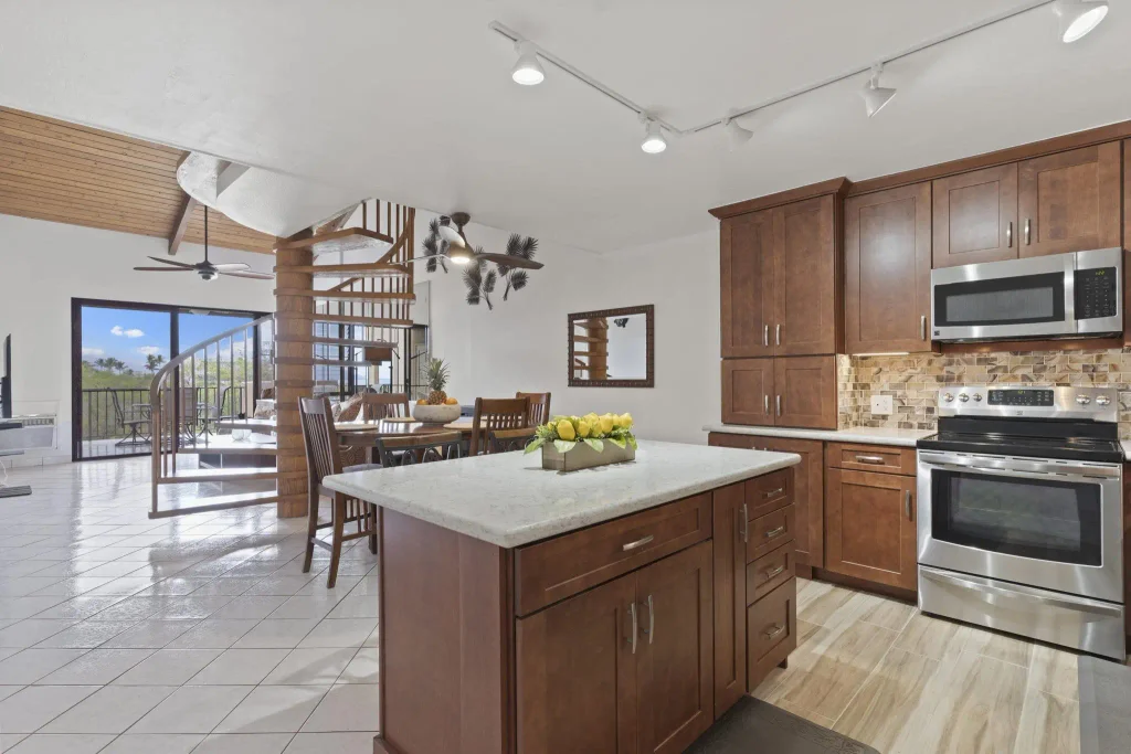 Idyllic living and ocean views are yours to relish in this picture-perfect Kihei condo at Kamaole Sands 4-412, set among 15 acres of tropical paradise overlooking Kamaole Beach Park III. Updates greet you at nearly every turn, including new plumbing and electrical throughout. Your living room features a 65-inch TV, an oversize air conditioner, and a new queen-size sofa bed. Just beyond the adjacent dining area, the remodeled kitchen has custom cabinets, quartz countertops, newer appliances, beautiful backsplash and upgraded tile flooring. Both baths are beautifully reimagined with high-end finishes, custom glass, quartz countertops, tile flooring and recessed lighting. The upper-level bedroom is accessible by a dramatic spiral staircase. Relax as you take in inspiring panoramas on the generously sized lanai where 6 can sit in comfort on brand new furniture under an outdoor fan with lights. For your convenience, there's custom shelving/attic access in the closet and storage for guest beach supplies. Notable perks include a laundry closet with a new full-size washer/dryer. Enjoy playing in the ocean or South Kihei's largest resort pool, tennis on the well-maintained courts, a fitness center, outdoor grills, and more. You'll find over a dozen restaurants within 6 blocks, plus the Kihei beach is right across the street. Immerse yourself in the island lifestyle most only dream of. Come for a tour while you still can!