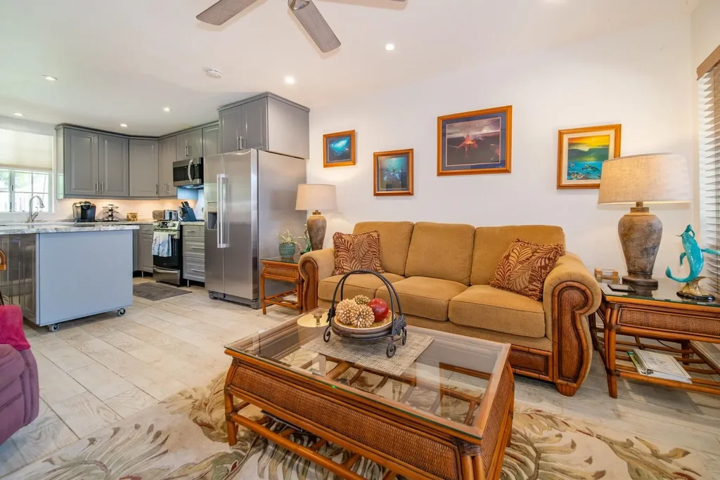 Beautifully renovated home, stylish contemporary kitchen featuring new quartz counters, new “Frigidaire Galley” convection stove/oven and microwave, wine refrigerator, farm sink, with a lovely quartz breakfast island with significant storage, gray tile plank flooring thought out the home, Mitsubishi split A/C system, remodeled bathrooms with safety features and more. Fantastic location with lovely Haleakala views, beautiful yard with mature trees, patio with pergola for outdoor dining, no buildings behind you, only privacy. Two parking spaces, sold furnished, personal artwork and king bed excluded. This is truly a special property. A 5 minute walk takes you to the beach, pet friendly, children’s play area and night security.