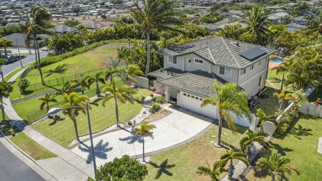 This exquisite island sanctuary home represents the essence of luxury in paradise. Surrounded by gorgeous ocean and mountain views, 16 Kamalei Circle is perched at the top of the Island at Maui Lani, a sought-after gated community in an extraordinarily convenient central Maui location. The home features a fabulous floor plan with the primary suite and three bedrooms on the upper floor, plus an additional bedroom on the ground floor. The decor includes granite countertops, travertine flooring, and waterproof and scratch-resistant wood flooring. A spacious back yard provides a private oasis, complete with a large pool, a rock wall waterfall, and focal-point dolphin water features. The property boasts lush landscaping and the privacy of having no neighbor on one side. Ideal as a primary residence or a vacation home, 16 Kamalei Circle also offers two-zone central air conditioning, 25 photovoltaic panels, and new window shutters throughout.