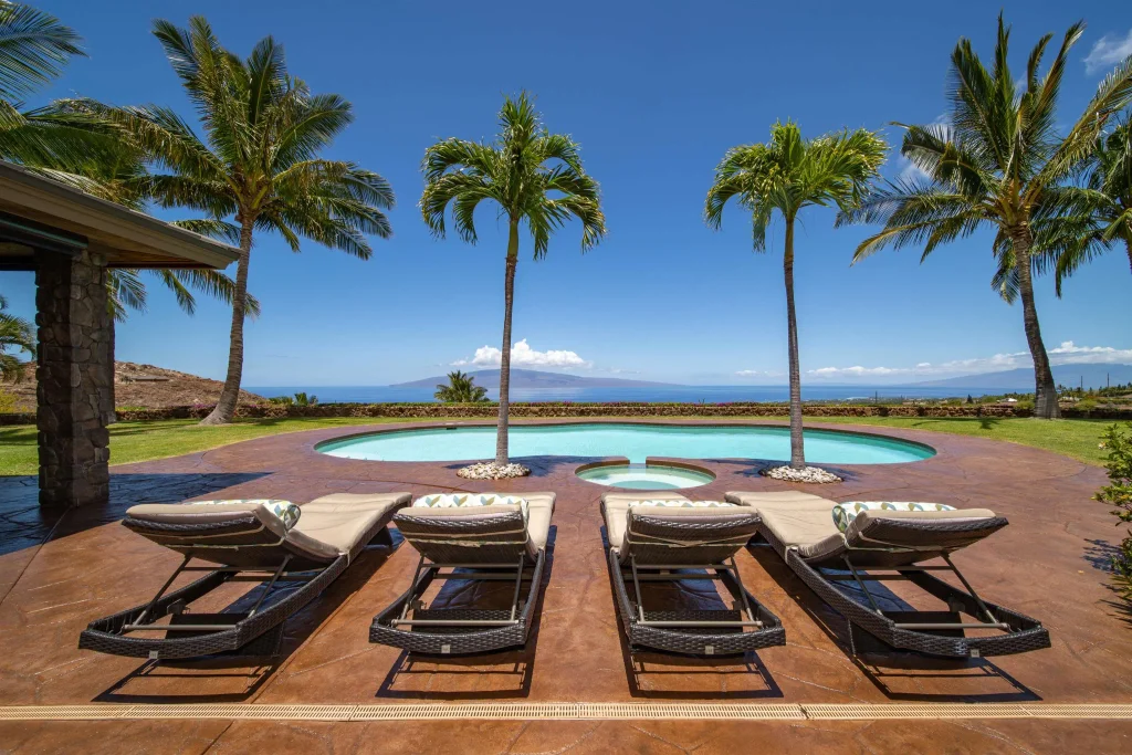 Come home to the view that takes your breath away. Sitting on the top of the hill, looking out across the ocean to the islands of Lanai and Molokai, watching the most amazing sunsets year round while you relax by the pool and enjoy the peace and quiet. This well appointed 4 bedroom , 4 bath home of 3387 sf, is a one story ranch style home. With the pocketing doors that lead directly to the outside eating and pool deck, the open floor plan of interior living, kitchen and dining melds to the outside living of poolside fun, dining or relaxing in the spacious 2 acres of tropical landscaping surrounding the home. A 328 pool house with its own bath and outdoor shower, sits close by surrounded by the coconut trees. Finishes include the travertine floors, imperial plaster, rich wood cabinets, tall ceilings, a double master shower, 2 outdoor showers, 3 car garage and comes furnished so you only need to bring your toothbrush! Located conveniently above the Launiupoko beach park, minutes from Lahaina town, the golf courses, shops and restaurants. This is a cpr'd property for just the main house build out. Easy to show.