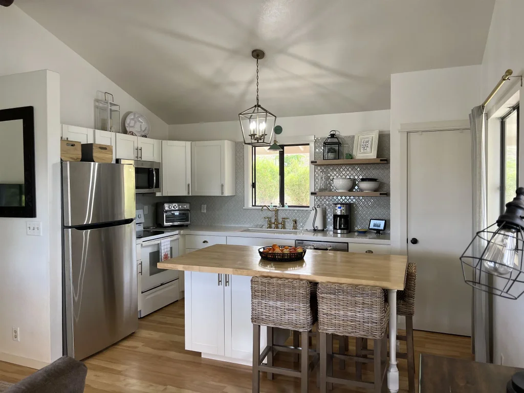 “Priced To Sell" This wonderful 2 bedroom, 1 bath, plus den is located on a peaceful cul-de-sac. Enjoy the ocean and mountain views, cool weather, and relaxing home. This home has the WOW FACTOR and displays complete pride of ownership. The home includes new kitchen cabinets, quartz countertop, cracked glass tile backsplash and an island in the kitchen with a butcher block top for easy cooking and dining. The house has newer appliances and house upgrades that include interior paint, ceiling fans, new flooring and baseboards, bathroom vanity and toilet, new roof and gutters, exterior paint, epoxy coating in carport for easy cleaning, extra-large lanai for visiting, as well as a water catchment barrel for gardening and new exterior doors. The comfortable and relaxing atmosphere of this home will make anyone able to move in with ease! This is a CPR property. With 6,643 sf of land with room to garden or to sit and enjoy the wonderful views. Call today to schedule a showing of this charming home!"