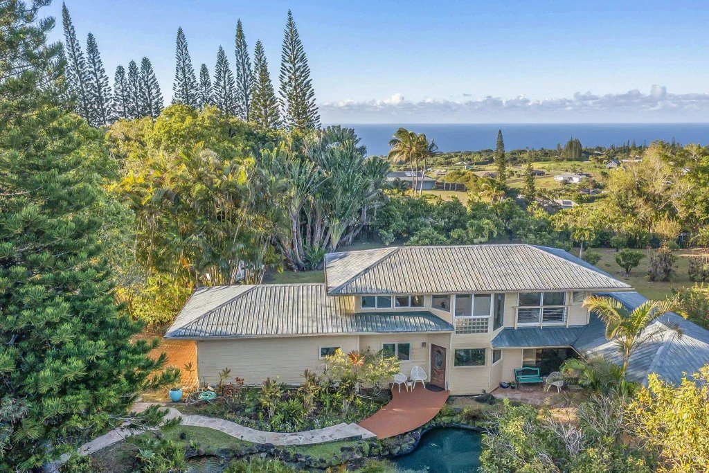 Peace and tranquility await at this very private 2 acres at the end of a country road. The house consists of 3 bedrooms, 3 bathrooms, on 3 levels, with bamboo floors and open beam ceilings. The main/entry level features a Koa and granite kitchen with a walk-in pantry, dining area, and a sunken living room. 2 walls of glass frame the lush forest views, a pond, and a sunny deck. The second bedroom and bathroom are also on this level with doors opening out into the backyard. Upstairs is the main bedroom and bathroom with views of the ocean on one side and the rainforest on the other. The large dressing area could double as a yoga studio with an attached deck. A sweet sun/reading room rounds out the space perfectly. The 3rd bedroom, downstairs, is self-contained and lives like a studio unit with it's own entrance. Outside, several seating areas, and a shower elevate your outdoor lifestyle. A citrus orchard, giant traveler palms and many flowering plants make the backyard a lovely place to spend time, with plenty of room for a pool if desired. If that's not enough... meander down a path to the large jacuzzi in the woods for wine and pupu’s, or take the trail to the natural stream and your own waterfall!