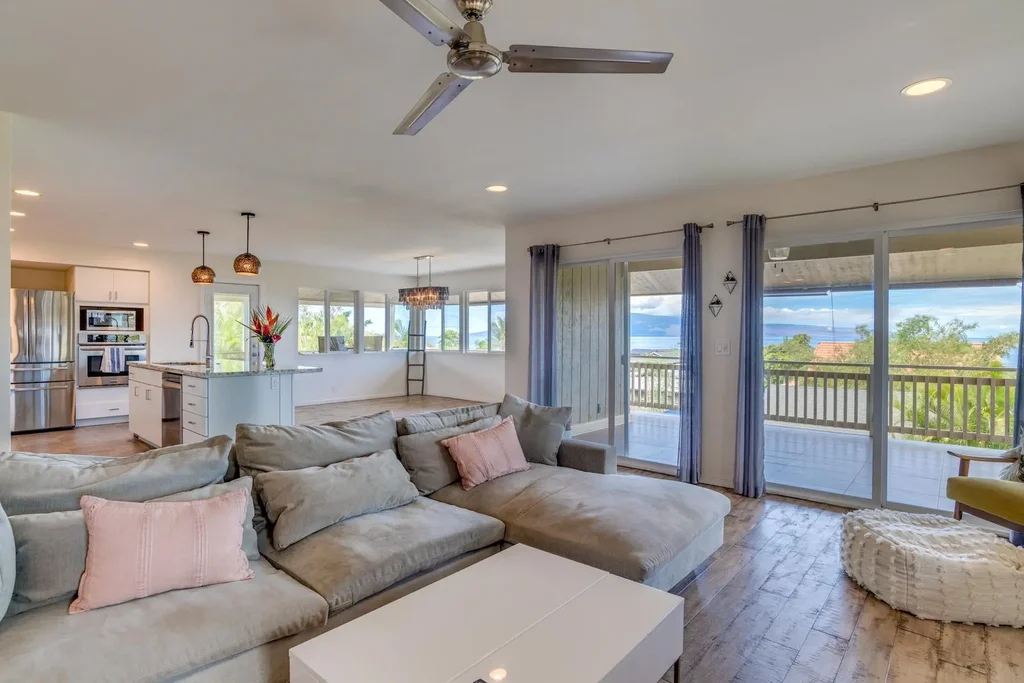 Gorgeous 3 bedroom, 4 bath, 3,069 sq. ft. single family home with a beautiful pool and a big ocean view in the neighborhood of Wahikuli in West Maui! Top level corner lot on nearly a quarter acre offered at $2.1 million. Enter the home under a nice carport to the main floor and have access to both the primary and secondary bedrooms, both with ensuite bathrooms. As you walk through the entry you pass an additional powder room and then on to the great room with an open feel and floor plan along with a large kitchen space and island counter. Here you’ll find yourself gazing at panoramic ocean views and amazing sunsets. The lower level has an additional bedroom, bathroom, laundry area and office room. Solar panels are owned and net metered. Plank hardwood flooring throughout much of the house and beautiful porcelain in the bathrooms and kitchen areas, all are in great condition. The home comes with 6 split level units to always provide optimum comfort. There is also a separate entrance on the North side of the property for additional living space including a bedroom, bathroom and full kitchen. This area includes two additional parking spots. The ohana has not been permitted.