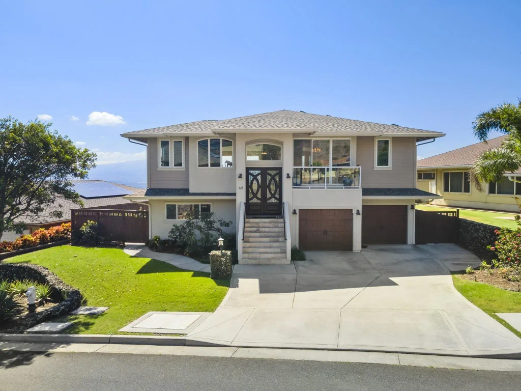 Exquisite 5 bedroom 3.5 bath contemporary home in the well established and privately gated Koa at Kehalani subdivision. This superbly crafted, architecturally drawn mansion offers the best utilization of this fantastic parcel to capture outstanding views from every room. Enjoy spectacular unobstructed bi-coastal views of the ocean, Haleakala and West Maui mountains. This split level design offers a spacious great room with high ceilings, an open concept living room, gourmet kitchen, formal dining room, large corner office, guest powder room and the ensuite primary bedroom with a walk-in closet that is the size of another bedroom. The ground level has a family room, full bathroom, 3 car garage and a beautiful all new 442sf addition built in 2021 featuring beautiful wall to wall travertine flooring with custom kitchenette and full bathroom. This is a wonderful option for a ground floor primary bedroom or bonus in-law quarters. There is three additional guest bedrooms with large sliding glass doors that open onto the lovely landscaped garden with fruit trees, succulents and a covered lanai to enjoy great views from this back yard. Home includes an "owned" 50-Panel Photovoltaic System, solar hot water system and split AC throughout. The lot is fenced for privacy which is great for children and pets. Located in the heart of Central Maui, just minutes from schools, shopping, county and state buildings, restaurants and the hospital.
