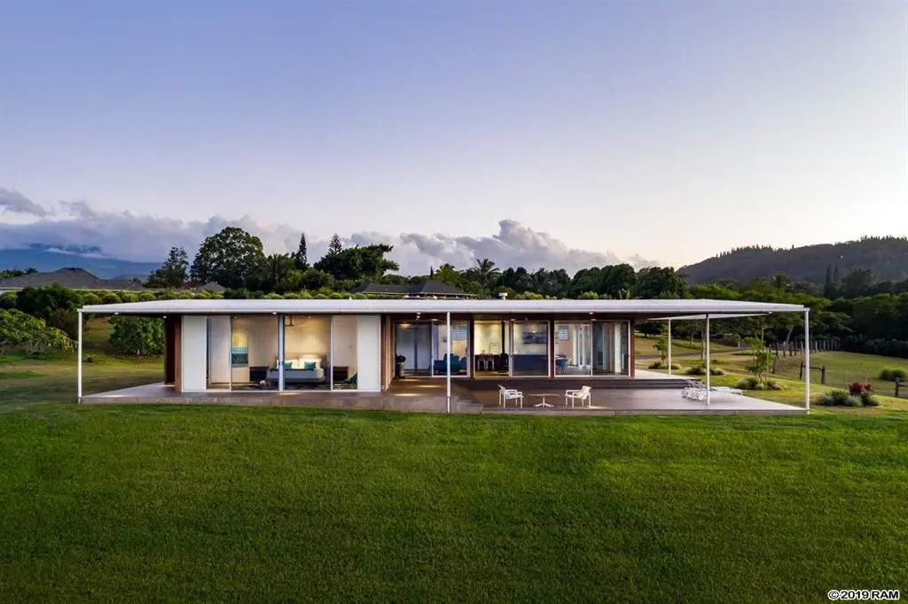 This stunning 15 acre Haiku estate sits atop a forest canopy that frames panoramic views of the ocean and the West Maui mountains - the views from this home are truly exceptional. This modern custom home was architecturally designed and was inspired by the Farnsworth House and The Glass House, two mid-century modern classics. The unique combination of zen minimalist modern design and materials blends with the natural wood accents and the outdoor setting to create a mid-century modern meets plantation style feel to the house. A large open concept living room kitchen area is surrounded by glass sliders that provide a close connection with the natural surroundings. This central internal space features two walls of floor to ceiling windows and doors that provide for natural light to flow in and all around the interior spaces. These large windows seamlessly connect the interior space to the huge outdoor covered lanais that surround the whole house. The spacious kitchen, with top-of-the-line appliances and custom koa woodwork is the centerpiece of the home. The house also features a large master suite, surround sound, lava stone showers, a study and utility room, a modern wood burning fireplace, Italian tile floors, and rich clear cedar paneling adorns the home inside and out. This 15 acre estate property is composed of four lots (4, 2.8, 6.2 and 2 acres respectively), and there are three County water meters, and a private well in place. This agricultural subdivision is contiguous, so a discerning buyer can buy all four lots together and create a truly unique private estate by building other homes and structures on this parcel. The grounds provide ample room for an equestrian estate to be developed and there is a pleasant mature orchard with a wide variety of fruit trees.