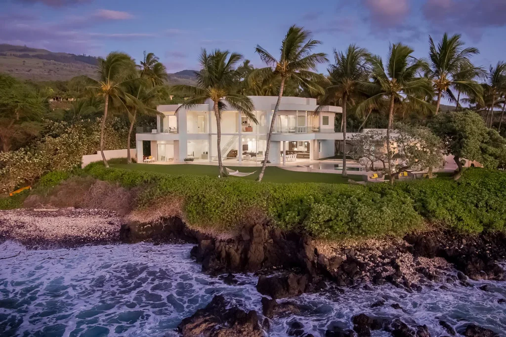 Makena Modern. Maui’s ultimate oceanfront estate presents a rare opportunity to experience the island’s majestic landscape as living art. Positioned for optimal views and utmost privacy, on the Po’olenalena point in Makena, this property astonishes. This Modernism Architecture Masterpiece is situated on 158 linear feet of ocean frontage with breathtaking views of surrounding outer islands, Mauna Kahalawai and endless coastlines. Custom built for the original owners and available for the first time ever. Designed by renowned Maui architect, Rick Ryniak, this extraordinary residence harmoniously combines the geometric simplicity of modern angles with softly curved white walls. Two-story glass windows and soaring ceilings create rooted connectivity with the aqua Pacific Ocean and contrasting lava rock. Continuous sliding glass doors give way to sweeping ocean views and cooling trade wind breezes. Drenched in natural sunlight, the open concept living space was created for seamless entertaining and ideal flow. Host family and friends in five ensuite bedrooms, each with a private lanai. The main level is accented by a floating staircase and a primary bedroom suite. An elevator provides easy access to a second level primary bedroom, two spacious ensuite bedrooms and a den/home office. Spiral skyward to the 1,507-square-foot rooftop deck and admire expansive bird’s-eye views. Stargaze from the rooftop jacuzzi or watch whales breach from the observation deck perched above the ocean’s edge. This stunning home’s resort-like spa amenities feature two swimming pools, two spas, a cold plunge pool, dry sauna, steam room and fitness room. The gated property offers direct ocean access and privacy, hidden from foot traffic and street noise. This desirable location in Makena is conveniently near the Wailea Beach walking path, Shops of Wailea and Maui’s world class golf courses.
