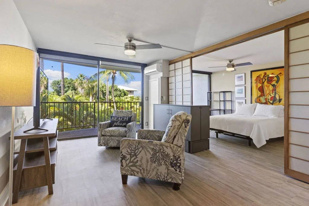 Searching for your own slice of paradise in a fabulous location on the South Maui coast? Immerse yourself in the ultimate island lifestyle with this one bedroom one bathroom second-floor condo in Kihei, set behind a secured entry and offering treetop views of the ocean from your 111-sq ft covered lanai! Living just a few minutes away from Cove Beach, Charley Young Beach, Kamaole Beach Park I, and Kalama Park, you'll have easy access to surfing, standup paddle boarding, sand volleyball, and so much more. The updated interior is open-plan with recently installed luxury vinyl flooring bathed in natural light by floor-to-ceiling sliding glass doors. Impeccable upgrades in the kitchen include brand-new cabinets, stainless steel appliances, and gleaming countertops that extend to the breakfast bar. Sliding shoji doors open to reveal the ensuite bedroom, and this unit comes furnished with a Murphy bed. Enjoy relaxing outdoors in the residents' pool and BBQ area, surrounded by lush landscaping. Other must-have benefits of this remarkable residence include a washer/dryer, 1 assigned parking stall, 2 split AC systems, an elevator, and extra storage available on the ground level. Pets and vacation rentals are prohibited, but long-term rentals of 6 months or longer are allowed. Everything you could ask for awaits in this move-in-ready home, so come take a tour before it's gone for good!