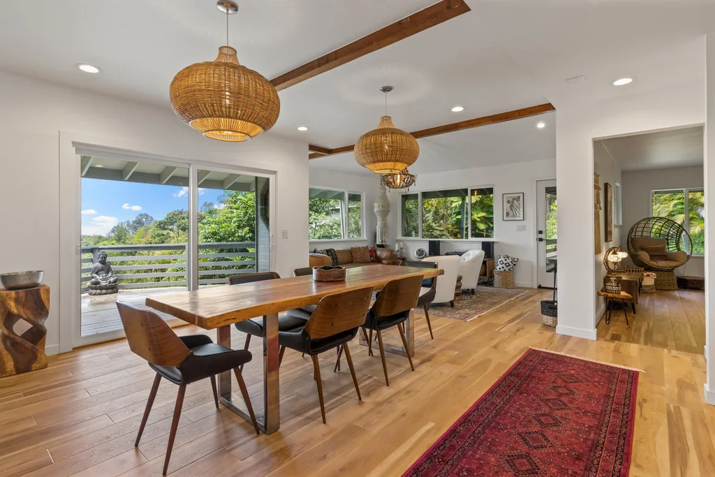 Epic ocean and mountain views from this extraordinary Haiku estate. “Town and Country” best describes 1660 Kokomo Rd. which features fully renovated residences on over 2 acres of peaceful nature and paradise. From the moment you set foot on the property, you will be instantly captivated by the vibrantly lush and tropical foliage with plentiful mature trees overlooking Maliko Gulch. There is a great separation of space between the 3bd/2ba main home and the detached 2bd/1ba accessory dwelling on the property. This is the perfect setup for multi generation living, a successful rental property, or an upcountry flower farm. The home is fully equipped with a seller owned photovoltaic system for both the main house and the cottage. The great room of the main home speaks volumes for the seller’s pride of design and ownership. This space exudes an incredible warmth with all of the natural wood textures that bring in the outdoor jungle vibes. The spacious and contemporary kitchen is well positioned with easy access to the great room and central hallway. Recent renovations include all new flooring, high energy efficient stainless steel appliances, white quartz countertops, and open shelves above the kitchen counters that will inspire artful cooking. Wood-plank vinyl flooring and freshly painted white walls accentuate the spacious feeling of the home which includes 3 bright bedrooms, 2 full baths, and a bonus room. All of the bedrooms have numerous windows allowing for solid ventilation and light. The large lanai of the main home is really an extension of your living interior which provides an extra space that blends nicely to indoor/outdoor living arrangement. The ohana features a gorgeous, lush, tropical view from its 300 sq ft covered, screened in lanai. The location of 1660 Kokomo is exceptionally convenient to both the Haiku Cannery Marketplace and Historic Makawao Town. Lots of nearby restaurants, food trucks, art galleries, fine boutiques, and overall upscale amenities. The Montessori School of Maui, Seabury Hall Preparatory Academy, and Ho'okipa Beach Park are all within a 10 minute drive of this property. Finely appointed and being offered fully furnished by the sellers.