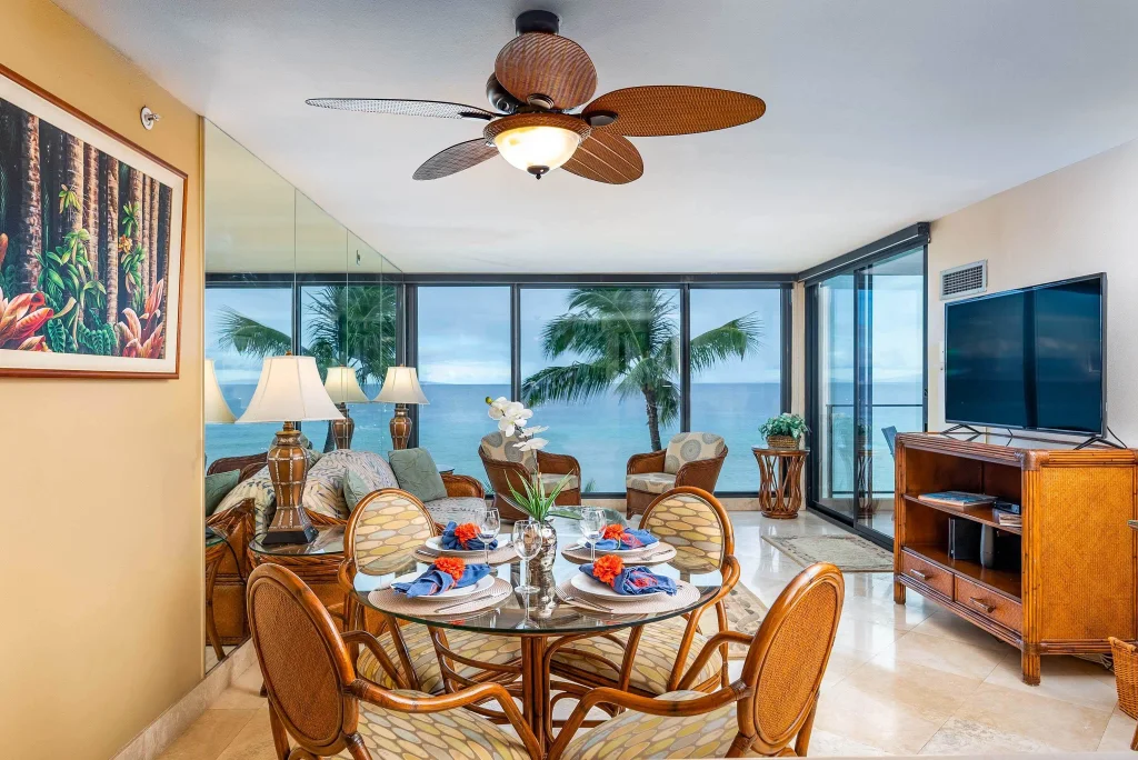 Fantastic 5th floor location at the Mahana in the Lanai Tower. Beach front living at its best with unobstructed ocean views with the majestic islands of Lanai and Molokai as a back drop. Mid-level on the 5th floor means you can truly live the beach lifestyle while still enjoying complete privacy and stunning panoramic views from the floor-to-ceiling windows from both the living room and the oceanfront bedroom. There is beautiful Italian travertine tile throughout with new dual-pane sliding glass doors in the living room and bedroom to the lanai that provide for quiet sleeping at night. Custom sunscreen window treatments in the living room maximize your view while still blocking out afternoon sun. Imagine sitting on your covered lanai and enjoying the spectacular ocean views and having a front row seat for watching the humpbacks whales in the Winter and turtles year round. The Mahana offers all the amenities of a luxurious condominium resort: a heated oceanfront pool and jacuzzi, shuffle board, a large private grassy area with lounge chairs overlooking the Pacific, a private tennis/pickleball court, BBQ area, ATM, computer terminals. The Mahana offers a quiet and relaxing tropical oasis getaway, centrally located between Lahaina and Kapalua with golf just minutes away, and nearby restaurants, bars, grocery store, and farmers market all within walking distance. Nearby there are numerous shops and restaurants including Dukes located along the boardwalk. The current assessment is $1,136.11/month and is being paid monthly through 3/2027 in addition to maintenance fees.