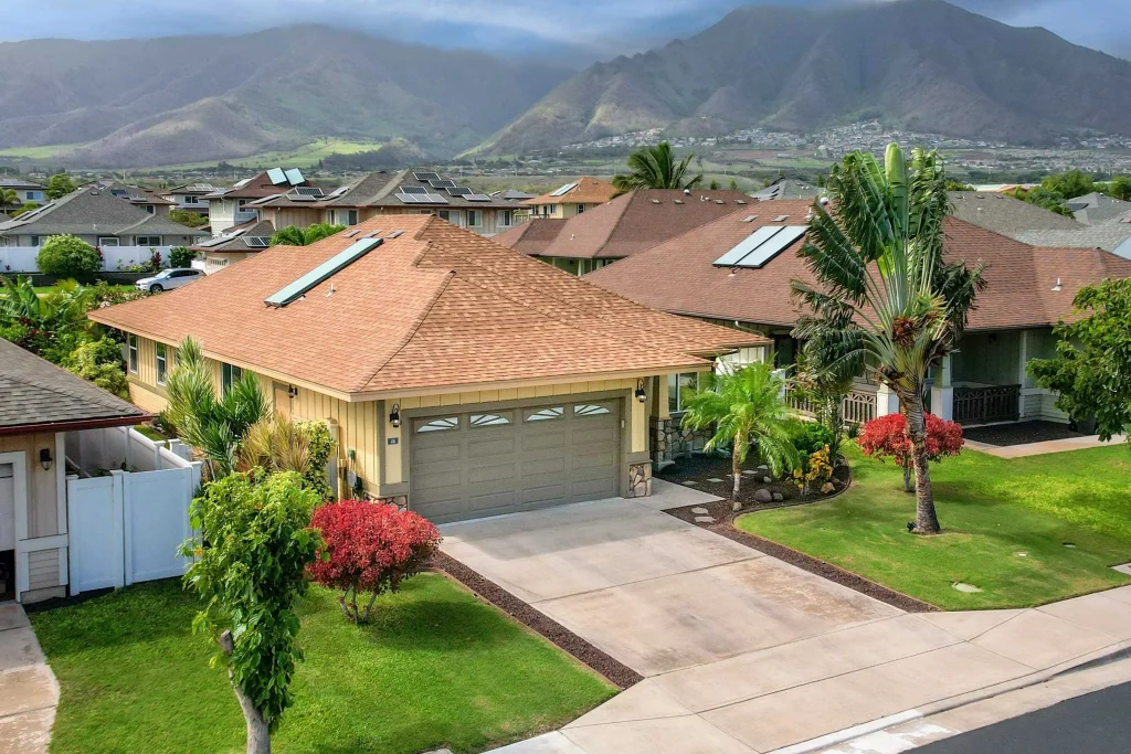 Spectacular Haleakala and West Maui Mountain views from this single level, lovingly cared-for home by one owner in a great subdivision -- Na Hoku is part of the Maui Lani Masterplan. Location is close to all the amenities of Central Maui including hospital, medical clinics, county offices, and malls. Home features high ceilings and an ideal, open floor plan including 3 bedrooms, 2 baths, and a 2 car garage. Many extras all around including a gorgeous kitchen, an open, bright dining room and living room area, and an expanded, covered lanai out back with slate tile flooring to enjoy the private, tropical backyard. Fully irrigated around the fully landscaped yard with a custom drip system in each of the garden beds and the raised beds along the back. All in all, you have to see to appreciate.