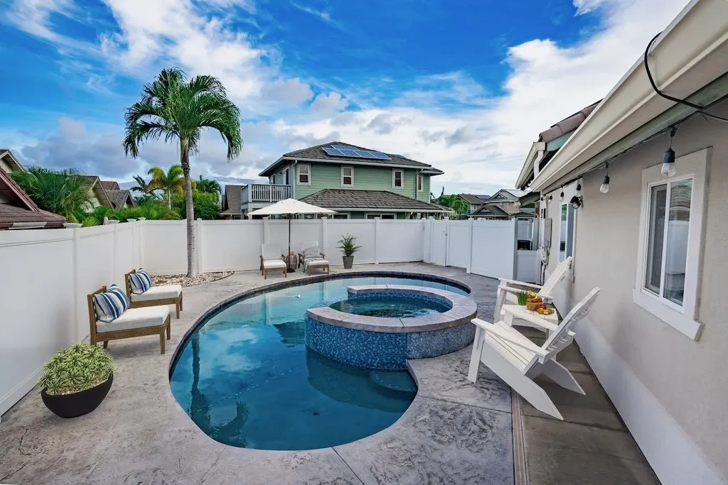 E Komo Mai to 31 Molehulehu Loop, centrally located in one of the largest lots of the coveted and master-planned community of The Legends at Maui Lani. This St. Andrew's model home sits on a quiet cul de sac and offers tropical living at its finest boasting a recently built-in $100K saline pool with a heated jacuzzi and stamped and sealed deck. The trellised lanai is the ideal spot to lounge poolside and enjoy commanding views of the west Maui mountains while the fully fenced yard with palm-bordered lawn offers complete privacy to relish outdoor living. Highlights include bamboo laminate flooring, digital security alarm, solar water heater, Monier tile roof, upstairs and downstairs separate central a/c units, a new irrigation system, a brand new salt cell in the pool, and a 33-panel leased PV system. The spacious master bedroom is advantageously located downstairs with easy access to the lanai and features new flooring and a master bath with a jacuzzi tub. Other notable features include a workstation upstairs, a laundry room conveniently located inside downstairs, and a 2-car garage that offers ample storage space. The leased solar system helps to keep the electricity bill affordable while still running the central ac on hot summer days, or even while making it a tradition to fire up the jacuzzi every evening after a long day of work or play. Images have been virtually staged to better showcase the true potential of rooms and spaces in the home.