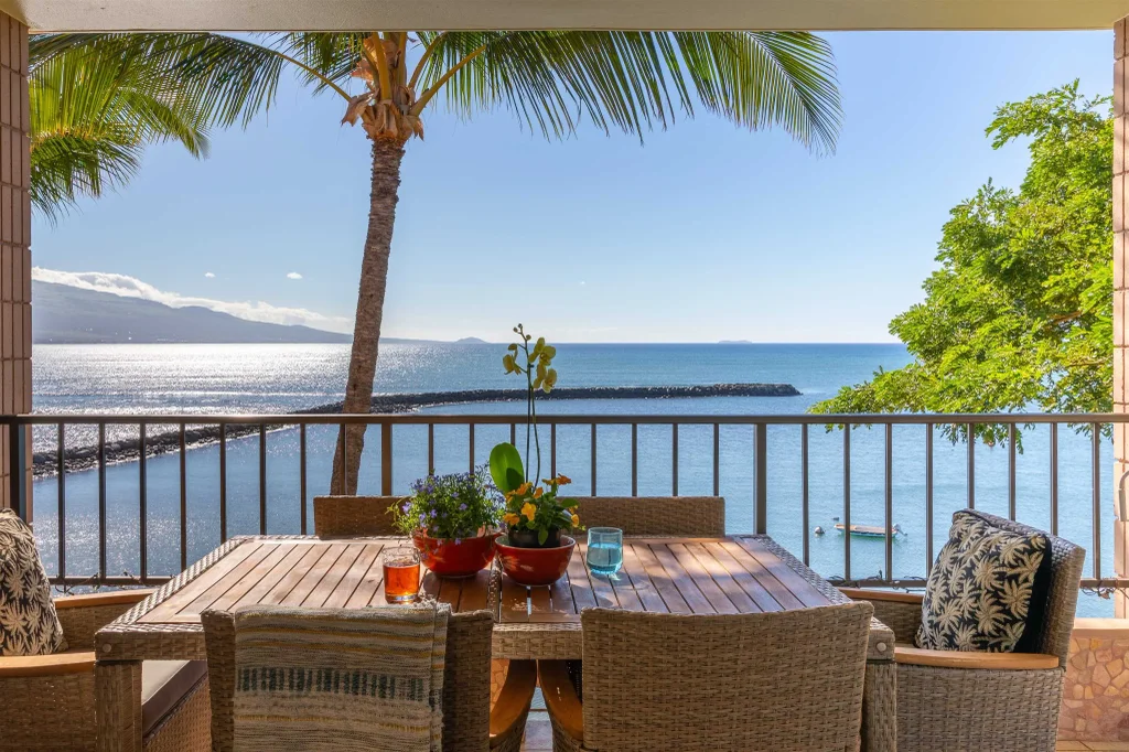 Ode to a Lanai: "Dearest Lanai, you've captured my heart and I never want to let you go. You wrap around me and hold me above all the other lanais unselfishly offering me views that bestill my heart. Your big green tree friend offers me protection while letting me watch whales and harbor boats. You sing to me the gentle lullaby of the ocean meeting the breakwater." You may find yourself waxing on like this when you move in to unit 410. There are only four lanais in this complex this large, and this one is the penthouse! Included with this lanai is a beautifully styled 2 bedroom, 2 bathroom condo with light pouring in from 3 sides. Watch whales breeching from the gourmet kitchen featuring Viking appliances. Come and linger here and work on your own love letter! This unit is being sold fully furnished with a few exclusions. Maalaea Yacht Marina is a lovely residential leasehold complex.