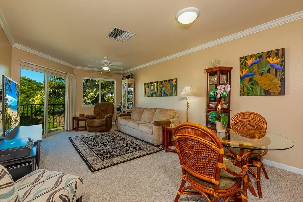 Hale Kanani enjoys a prime, central location directly across from South Maui's best beaches & convenient to fine dining, shopping, plus world-class golf & tennis. This light-filled, top floor, 2 bedroom, 2 bath, 890 sf unit is in impeccable condition. Pristine & Immaculate are suitable adjectives! The open floor plan allows for comfortable conversation as the kitchen opens seamlessly to a lovely dining area & large living room with its fine quality geometric patterned berber carpet. The kitchen boasts Kenmore Elite white appliances, maple-wood cabinetry & lovely Silestone countertops with a six inch back-splash. Floors in the kitchen, both baths & the front entry area are tiled porcelain. Elegant crown molding runs the entire perimeter of the main living area. There is excellent access to the large bias-tiled lanai from the living room & the primary bedroom.The lanai affords extra storage, ample seating, alfresco dining & a partial ocean view expanding as the Manila Palm lined view corridor matures over time! Both bathrooms feature floor to ceiling white porcelain subway-tiled showers, custom glass sliders & oil rubbed-bronze fixtures. The primary suite has a walk-in closet while the guest bedroom has mirrored closet sliders. Recently replaced Central air conditioning & 3 ceiling fans provide climate control. Hale Kanani is a pet-friendly building with elevator access, stucco exterior, baked enamel railings. Two tandem parking stalls come with the unit. Amenities include lush landscaping, pool, spa & BBQ area.