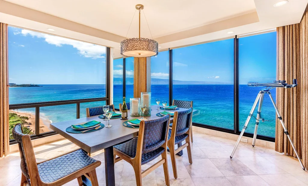 Discover this beautifully appointed and spacious two-bedroom residence at the Mahana situated at the north end of Kaanapali’s Kahekili Beach. A rare and coveted corner location on the south side of the Lanai building, it has floor to ceiling windows which frame the dramatic views of the sandy beach that extends all the way down to Pu'u Keka'a, Black Rock. The owners have thoughtfully renovated with custom details, special touches, and high-end designer finishes throughout. A reconfigured oceanfront dining area takes center stage with 270-degree views of the ocean and the outer islands of Molokai and Lanai. The living room features new furnishings and artwork from local artists and photographers. The bedroom suites have been upgraded with custom built in cabinets for ample storage and large walk-in showers in the ensuite bathrooms. Both the oceanfront primary suite and the mountain view guest suite are furnished with a hand carved, solid wood island–style bedroom sets, flat screen TVs, and room darkening Averte drapes. Additional design features in the primary suite include a built-in work area and full-size laundry. A new stainless-steel dishwasher, counter depth refrigerator, task and recessed lighting, and Haiku Silestone quartz countertops complete the bright, contemporary kitchen. Amenities at the Mahana include central air conditioning, an oceanfront swimming pool, a hot tub and BBQ’s, tennis/pickleball courts, beach access, and a private gate to the boardwalk that extends from Duke’s restaurant to Black Rock and then connects to the beach path at Kaanapali. The Mahana is close to shops, a popular food truck park, and many restaurants. As a vacation rental Mahana 1119 enjoys its reputation among many repeat guests as their special place on Maui.