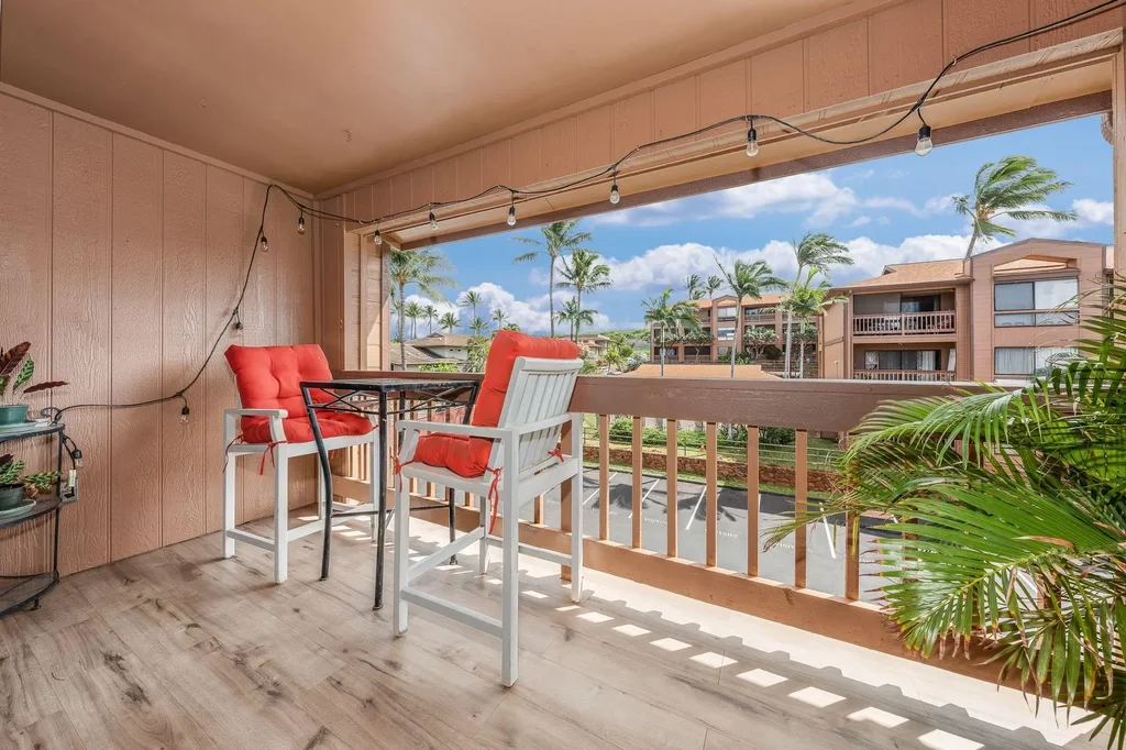 Remodeled and quiet fee simple unit located in the center of the Maui Lani Terraces complex away from road noise, but with great pool and mountain views! Step out on your lanai and see if your favorite pool chair is available! Totally move-in ready with new finishes and newer (2021) furniture. New in 2023: luxury vinyl plank flooring, vanity with marble top & soft close drawers, LED can lights and ceiling fans, Samsung range, interior paint, new base moldings, freshly painted white cabinetry. Newer in 2021: dishwasher, hot water heater, French door stainless refrigerator with freezer on the bottom, LG (full-size) stackable washer/dryer, lanai floor. Included furniture comfortably sleeps 4 with queen bed in primary suite and queen sleeper sofa, as well as 45" Samsung TV. A must see to appreciate the location and condition. The monthly maintenance fee includes water, sewer, trash, exterior maintenance/insurance, internet, cable and Reserve. Convenient to the Farmer's Market, beach park, and public transportation. Includes one parking space. No short-term rentals.