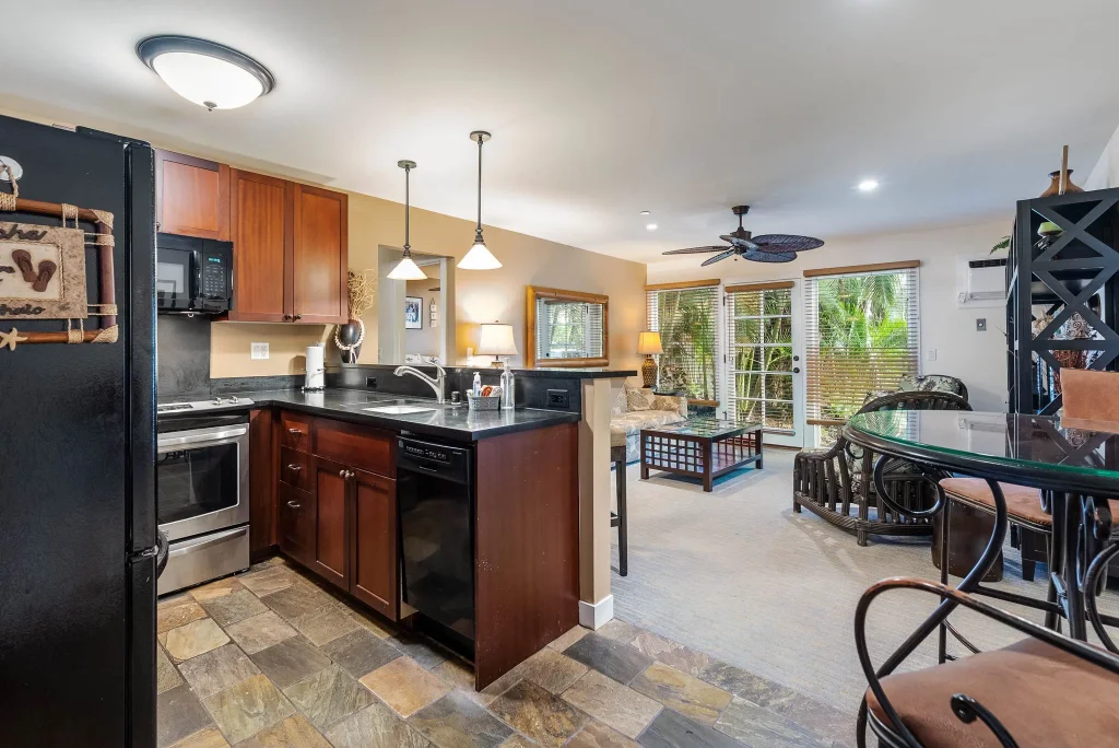 Aina Nalu J110 is a 2 bed, 2 bath condo in one of the most sought after complexes in Lahaina. It is all about location, location, location and Aina Nalu has a premier one. J110 is in a desirable end unit location on the ground level for easy in and out access. It has a full kitchen that opens to the living area which has a sofa bed, allowing the condo to sleep 6 comfortably. The living area divides the two bedrooms. The spacious main bedroom has a king size bed and an attached bathroom, which also includes an owner’s closet. The second bedroom has large windows for a bright open space and the guest bathroom also has a washer and dryer. Aina Nalu is an 8.6 acre oasis in the heart of Lahaina. Garden settings and private meditation areas surround every wing of the property. There are 2 pools including an infinity pool and hot tub, and the pavilion is a perfect meeting place for family and friends. It is the only vacation condo located in downtown Lahaina, just a short stroll from the best restaurants, shopping, cultural events, parades and great beaches.