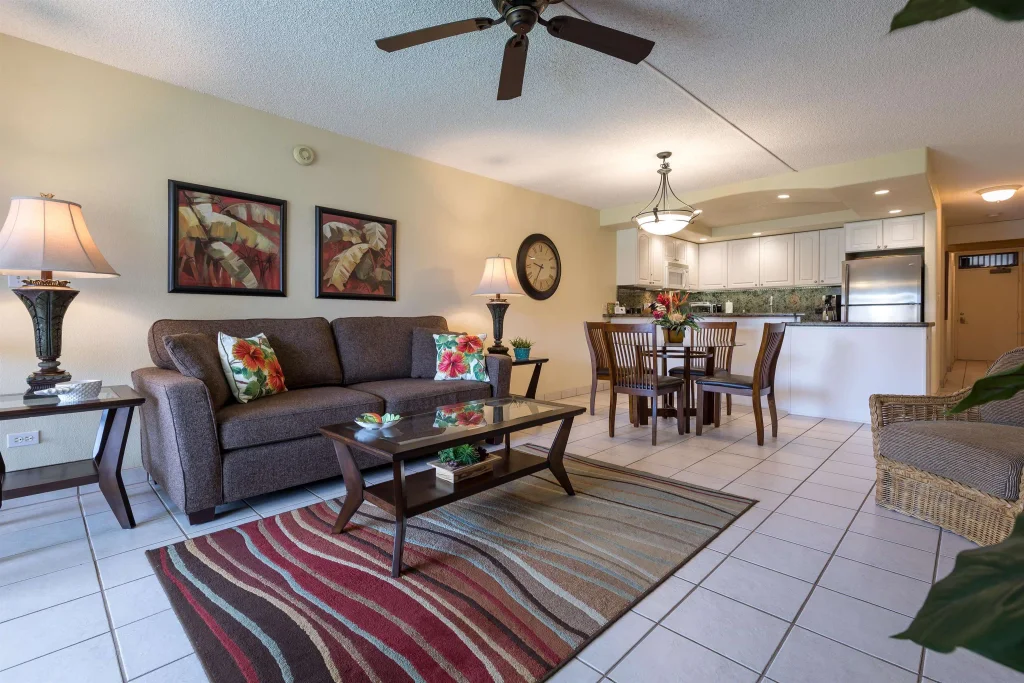 This 1 bedroom, 2 bathroom condo at Kamaole Sands has ground floor convenience, a large lanai, and a picturesque location within the middle of the inner court, all of the things that guests are looking for when booking a vacation rental. The condo is equipped with features including easy access to the pool and BBQ area's, tile flooring throughout, cabinetry with granite counters, AC in the living room and bedroom area, and a full sized washer and dryer. The condo is being sold furnished and is an ideal vacation rental unit. Located just steps away from Kamaole Beach Park III and in building #7 at Kamaole Sands, makes this an ideal location. Resort amenities include a children’s wading pool, an adult and family hot tub, fitness room, ping pong table, gas BBQ area's throughout the resort, and 4 tennis courts. Kamaole Sands is an extremely popular resort as the condo is within walking distance to restaurants, shops, and a number of great beaches.