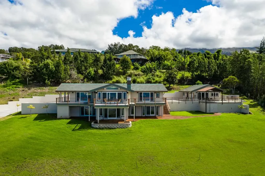 Completely & meticulously renovated in 2020, this approximately 3,079 s.f., 3 bedroom, 3.5 bathroom custom residence offers the quintessential Kula bi-coastal view experience! The stucco exterior walls & the glazed ceramic roof tiles, plus the copper gutters & downspouts, set the bar regarding quality. The elegant solid walnut front door is accentuated with finely detailed aluminum channels; a design theme present throughout the home. Upon entering, you are mesmerized by the compelling view of the West Maui Mountains, North & Southwest Coastlines, & the expansive Central Valley below. You will enjoy lofted white-washed ceilings, limestone floors, & recessed LED & custom pendant art lighting in the great room & kitchen/dining areas. Elegant warm-toned, soft-close, kitchen cabinets are juxtaposed with rich patterns of the fusion quartz center island, perimeter countertops, & full-height backsplash! There are brand-new stainless steel Bosch appliances, ample pantry space, & built-in wine cooler & wine rack. Wrapping around the kitchen, great room, & primary suite are spacious lanai areas with Ipe wood & stainless steel cable railings. The walnut-framed, book-matched, fusion quartz fireplace is a masterpiece! The elegant stairway to the lower level den & two bedroom suites features a Carrera marble hand-rail that adds a touch of elegance. All bathrooms feature under-lit furniture style cabinetry, porcelain tiled walls, & custom glass feature tiles, along with stone floors & quartz counters. A walnut feature wall adds warmth to the lower level den area, which also enjoys panoramic views. The Ohana finishes are consistent with the main house. There is a large motor court area & ample parking. There is also a significant amount of enclosed storage space. Enjoy life in stunning upcountry Maui!