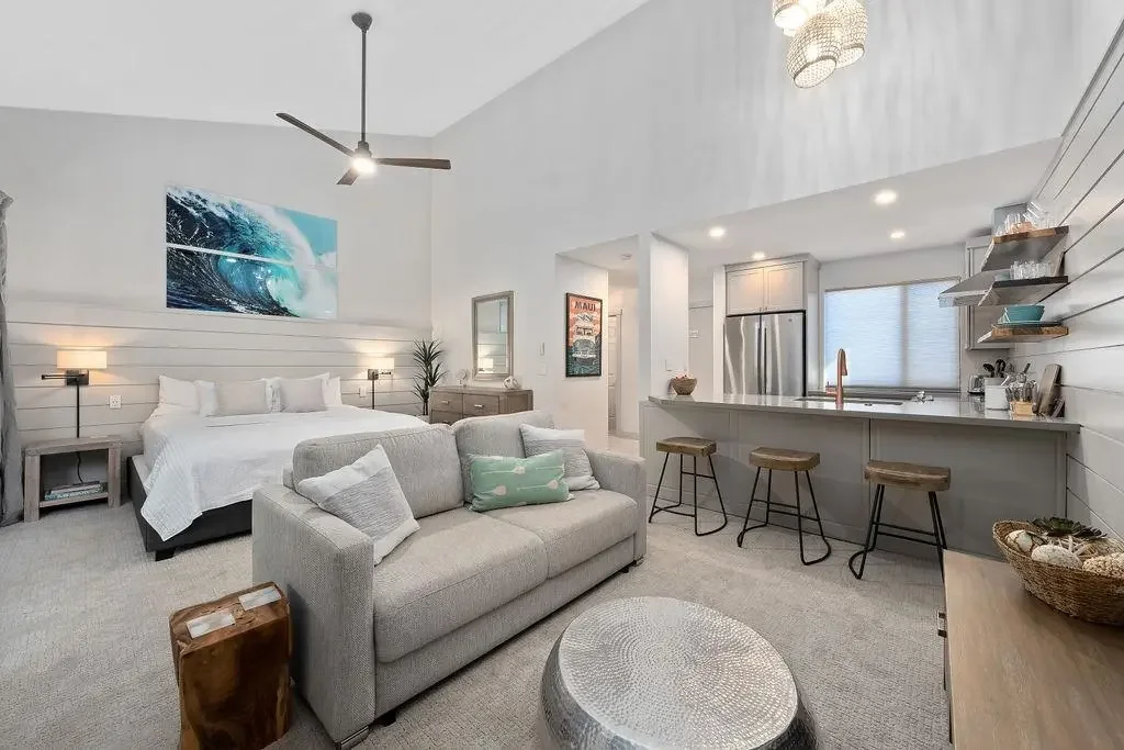 Recently Remodeled & Fully Furnished Costal Modern unit offers all the comforts of home in the prestigious resort community of Wailea! This stunning studio at the beachfront complex of Wailea Ekahi Village offers the Maui lifestyle with direct access to one of the States most desirable beaches, Keawakapu Beach. The entry of this 2nd floor unit welcomes you to your own personal oasis. Prepare beautiful meals while enjoying the natural beauty of Maui on the sizable lanai or counter seating for 3. The large covered lanai extends the outdoor/indoor space seamlessly and stay cool throughout the unit thanks to the brand new oversized room A/C system. Wailea Ekahi is one of the few beachfront complexes in Wailea, Maui. If you’re wanting a break from the sand while remaining beachfront, enjoy the oceanfront pool and newly renovated pavilion. Alternatively, if you’re after some peace and quiet, head to one of 3 additional serenity pools within close proximity to unit 52E. The fully furnished costal chic studio unit offers a welcoming aesthetic with live edge kitchen shelving, quarts countertops, luxury vinyl flooring and high-end carpet throughout, stainless steel appliances, and many other thoughtful and tasteful touches. Brand new walk-in tile shower with river rock flooring, glass door and tile accents. Everything you need for your personal use or vacation rental guests is provided, from beach chairs, cooler bags & beach umbrella, to a fully stocked kitchen. Currently a popular vacation rental garnering excellent 5 star reviews. If you are looking for an amazing turn-key home, or vacation rentable property, look no further.