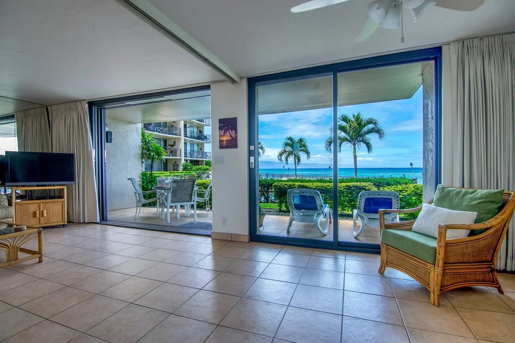 Your perfect vacation home! There is nothing like open air living when you’re vacationing on Maui. Experience the cooling tradewinds of this special location in Kahana. Custom dual-paned sliding glass doors invite the outdoors in. All units at Hololani boast ocean view 2 bedroom two bath floorplans, each with its unique place within the 2 high rise buildings. This first floor location is ideal for the convenience to the ocean, pool and bbq area, and it also has easy access from the underground parking up the elevator right to the front door. The ocean breezes and that endless view bring guests back to Hololani year after year. From morning breakfast on the lanai watching turtles to evening sunsets and the best seasonal whale watching, this oceanfront location is a place to call your own and enjoy making memories for years to come. Kahana is central to many of the best beaches and wonderful restaurants on the West Side. Hololani is an intimate resort with a residential feel. It is pet friendly, too!