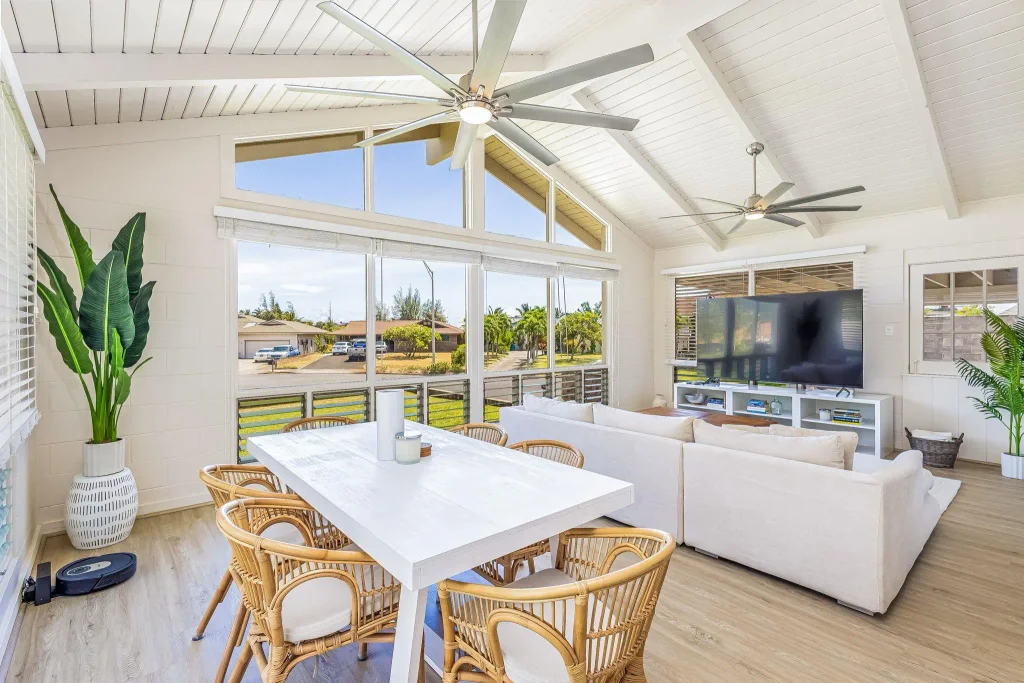 Welcome to 911 Lekeona Loop where all you need to do is move in & enjoy. Renovated in 2023 featuring a brand new kitchen, brand new bathrooms, and brand new flooring throughout. “Bo-ho Chic” was the theme of the renovation which was expertly executed. Beautiful white oak wood-like laminate flooring connects living to dining to kitchen and down the hallway to the bedrooms. The white walls, ceiling, and trim help bring a modernity to the space. The vaulted ceiling in the main living/kitchen space bring airiness and feeling of grandeur to the home. Both bathrooms were completely renovated (primary in 2022 and second bath in 2023). Each bedroom has brand new carpet (installed in July 2023). There is a huge 4 car carport where you can fit two cars tandem on each side of the port. At the back of the carport is built-in storage. The side yard has a concrete pad that is just calling for a sunshade or gazebo. The backyard features a terraced space, perfect for a beautiful garden. The front yard offers stunning views of the West Maui Mountains and a large, flat, grassy area perfect for the keiki. The roof was replaced in 2019. Seriously, what more is there to do besides pack your bags and move in? Do you love the décor? Me too. Furnishings are negotiable so call your favorite Realtor to help you work through all the details.