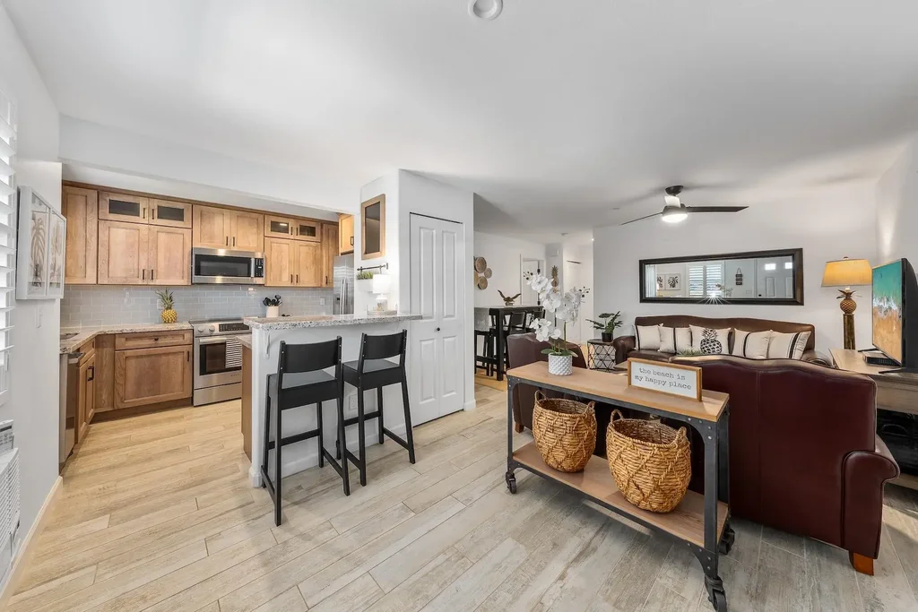 Relax on your covered front porch and watch the sunset over Lanai from this exceptional 2 bedroom 2 bath tastefully furnished condominium in the residential community of Villas at Kahana Ridge. Originally a 3 bedroom floor plan, it was remodeled to create a spacious primary suite with sitting area and office nook. Quality finishes include porcelain tile flooring, solid wood cabinetry, Bosch appliances, granite countertops, and plantation shutters on all windows. With 2 assigned parking stalls close to the front door there is only a single step to enter from the sidewalk. The lanai entry features an ample size sitting area and a custom sun shade for afternoon comfort. Designer furnishings complete this Maui beach style home. Villas at Kahana Ridge is a pet friendly community close to beaches, shopping, dining, and many services. This immaculate condo is move-in ready for a new owner.