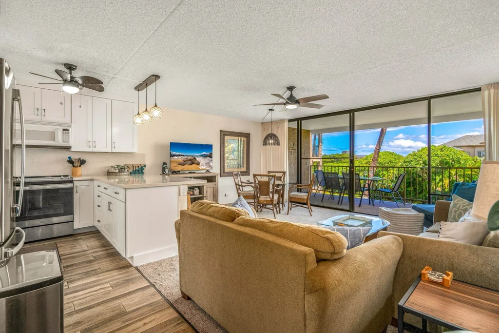 This 2 bedroom 2 bath is located in the heart of south Maui in close proximity to south Maui's finest restaurants, shopping and beaches. Updated throughout, porcelain tile flooring in the kitchen with the wood plank look, new carpeting in March 2023, peek-a-boo ocean view from the lanai, with a ramp from the parking lot to the front door, no stairs , and extra wide entry door and hallway for easy access. There is a generous sized lanai off of the main living space as well as off of the master bedroom. The complex offers a heated pool, hot tub and pickle ball court. A wonderful vacation rental property! Call your favorite REALTOR to schedule a private showing today. This one will not last, what are you waiting for??