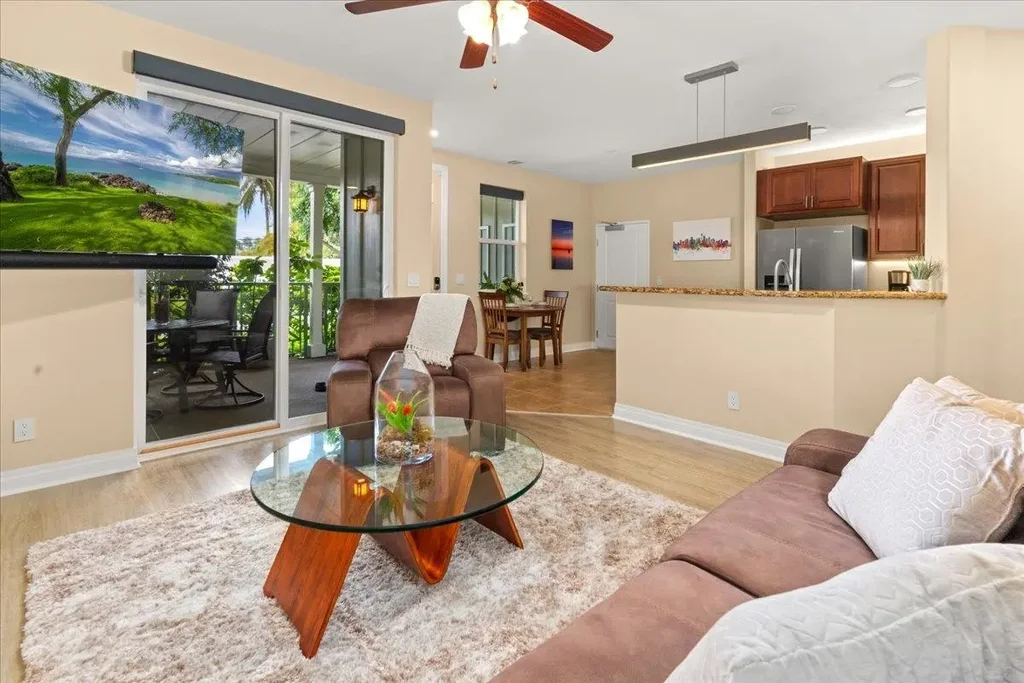 Seeking back up offer position #1. An immaculate two bed, two bath first floor condo with an attached single car garage, one block from the beach! It boasts 9ft high ceilings, granite countertops, cherry-stained soft close cabinets, under-cabinet lighting, and stainless-steel appliances. Luxury vinyl plank flooring in the living room, hallway, and guest bedroom, tile in the primary bedroom, and primary bath, and beautiful, easy-to-clean epoxy in the garage. Appliances replaced are the dishwasher, LG stackable Washer/Dryer Unit, and a 50-gallon water heater. You can easily control your lighting, entertainment, Lutron motorized shades, security, etc. from your phone using the Control4 smart home features. Lighting upgrades include Vandor pendant LED light, keypad dimmers and LED lighting installed throughout. Also, included is a surround sound home theater. There is extra storage at the private gated lanai entrance to the unit. Peacefully set back from the road, you can enjoy the shady lanai for an extra dining area and living space. Kai Ani Village is known to have one of the best resort-style infinity edge pools in Kihei. The common area has two well-maintained BBQs with a covered dining area and poolside cabanas to enjoy. So close to the beach, you can take a quick stroll to watch the sunset or the whales when in season. Kai Ani Village is located in the heart of Kihei steps from cafés, restaurants, gyms, salons, medical, groceries and more. This unit is incredible, and you must come see it for yourself!