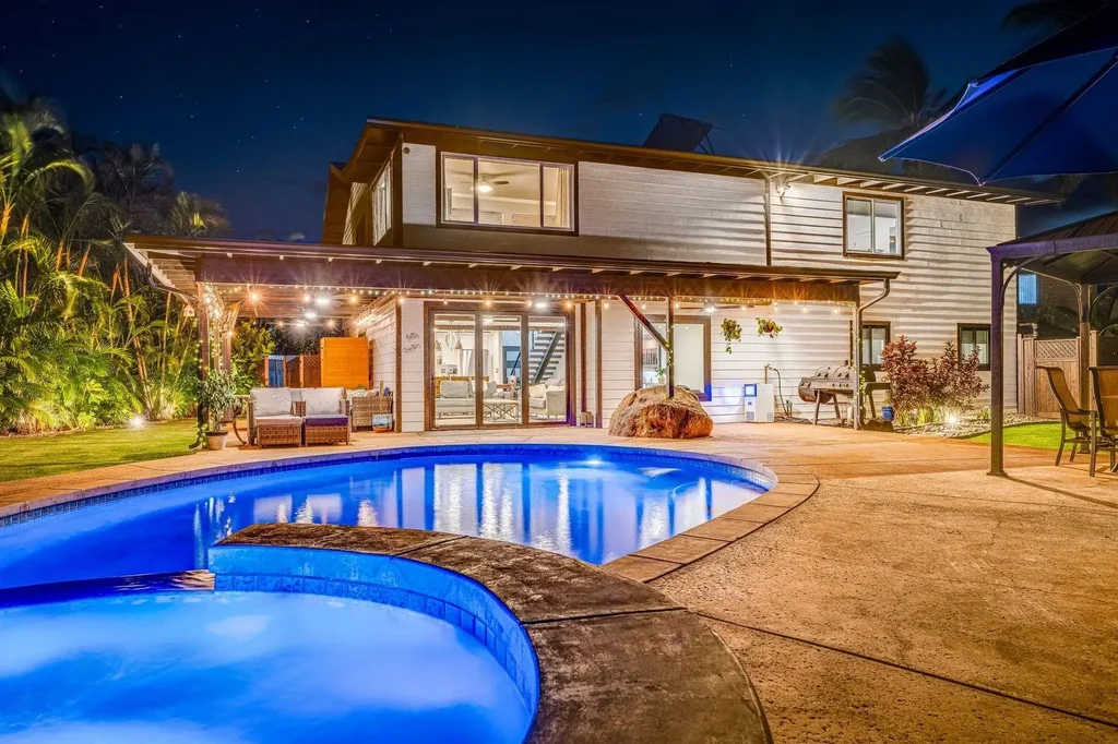 Nestled peacefully at the end of a cul de sac, this beautifully remodeled 5-bedroom home offers the epitome of luxury living. Step into a world of elegance and comfort, with two large kitchens, equipped with top-of-the-line stainless appliances, inviting the gourmet chef in you to explore and entertain. The primary downstairs kitchen boasts a massive pantry, providing ample space for culinary delights. Wander outside to the inviting yard, where you'll find immaculately kept, putting green-quality lawn and greenery. Adorned with tasteful landscape lighting, the grounds present an enchanting ambiance that's perfect for both daytime recreation and nighttime relaxation. The eye-catching pool and hot tub combo, designed with a lagoon-like aesthetic, create a serene oasis that beckons you to unwind. Inside, the primary bedroom is a masterpiece of space and design, featuring two impressive closets, one of which is grand enough to qualify as an additional bedroom. The primary bathroom offers a sanctuary for relaxation, complete with a spacious soaking tub, a steam shower with stone tile floors, and double sinks embodying sleek sophistication. Additional luxurious details include high ceilings, stunning fixtures, and generous living spaces that provide both warmth and functionality. The additional kitchen adds a versatile touch, ideal for hosting guests or multi-generational living or, if one was inclined to break up the two floor levels, you could have 4 bedroom house upstairs and two ohanas downstairs. Don't miss the opportunity to own this breathtaking property, where every detail has been meticulously crafted to provide a life of leisure and pleasure.