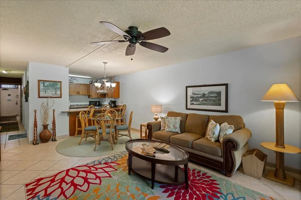 Kamaole Sands 8-107 is a 1 bedroom 2 bathroom vacation rental approved condo in South Kihei. This condo is sold furnished with linens and kitchenware. It is located on first floor in Building 8, has the largest lanai in building 8 that goes to a grassy area, it's quiet and offers a lot of privacy. Tile flooring throughout for easy maintenance, the second bathroom and kitchen have been renovated in 2018. The kitchen has granite countertops that open up to the living room area. There is AC in the living room to keep the unit cool. The complex is a popular vacation destination with great amenities: pool, hot tub, exercise room, BBQ, activity desk and tennis courts. Walk across the street to the popular Kamaole 3 Beach Park that monitored with life guards. The complex is well maintained throughout. Don't miss out! Contact your favorite Realtor to view this amazing unit!