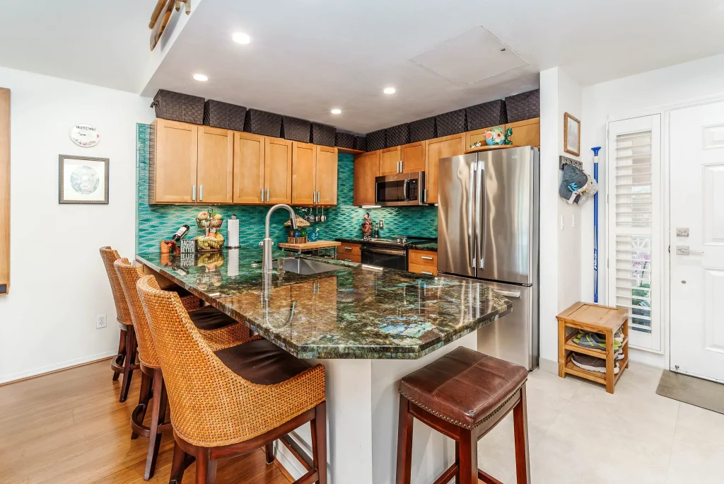 Entering this beautiful condo at Kai Makani, you immediately feel like you’ve been transported to a tranquil seaside retreat. With vaulted ceilings, this recently renovated 2 bed, 2 bath unit is bright and open with plenty of natural light. This residential style gem is a rare find in the sought after Kihei complex. The large great room easily fits a comfortable seating area, as well as plenty of room for a dining table. The great room leads out to a spacious and private lanai which has enough room to create the same space as inside. Imagine mornings sipping coffee and eating a luxurious breakfast at your lanai table while listening to the tropical birds, and evenings sipping a cocktail stretched out on your cushy lanai chairs and watching the sky fill with the brilliant colors of sunset. The unit has gorgeous engineered hardwood flooring throughout the main living area and bedrooms. The kitchen and bathrooms have cool, long-lasting tile flooring. The full-size kitchen is equipped with stainless steel appliances, beautiful granite counter tops and custom cabinetry. The backsplash has hues of ocean waves and brings a calming beauty to the kitchen. The main bedroom opens to the lanai, not only extending the space, but bringing in lots of natural light. The room has a queen-size bed, with space for bedside tables on either side and a large closet. The other piece de resistance of the main bedroom is the fantastic bathroom, it is a large, open space with lots of storage and a gorgeous shower, which has a variety of shower settings and a beautiful stone floor. The guest room has a queen murphy bed/desk combo that can be easily converted to a guest room or an office. Between the bedroom and bathroom are a full-size stacked stainless-steel washer and dryer. The guest bathroom has the same granite counter tops as the kitchen, beautifully tiled walls and a unique wooden barn door that slides in front of the shower, creating a private space. The shower features a rain shower head, and the same gorgeous rock work as the main bathroom. Kai Makani has a large saline pool, jacuzzi, gym, a community BBQ area, and beautifully landscaped lush green grounds. Located in North Kihei, it is close to restaurants, shopping and popular beach parks. This condo is a must-see, contact your favorite Realtor today for a showing!