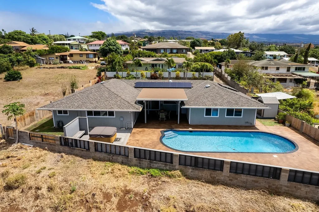 There is perfection in every aspect of this custom built beauty! This fully fenced single level home includes 4 spacious bedrooms, 3 full bathrooms and an extended family room with wet bar. Ultimate relaxation can be yours as you swim in the gorgeous pool or luxuriate under the stars in the steaming hot tub on a cool Pukalani night. There’s ample room for the whole family! There are so many outstanding features to mention; 40 photovoltaic (owned) net metered panels, solar hot water system, 6 split AC units, new Presidential top of the line 50 yr roof, Custom built mango wood kitchen cabinets, black granite countertops, gas stove, stainless steel kitchen appliances including a trash compactor and wine chill, ceramic tiled flooring, security system, open beamed ceiling, epoxy garage floor, new washer & dryer, new interior doors, vinyl windows and stamped concrete pool deck. To top it all is the enjoyment of seeing the breathtaking bi-coastal ocean views, West Maui mountains, Molokai and city views from this one of a kind, immaculately maintained, very private and ultra-fabulous property!