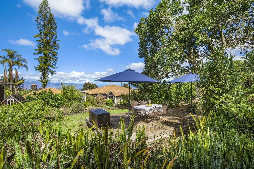 Welcome to Upcountry Maui and the magic of Keokea! This charming and quintessential half acre Kula property is thoughtfully nestled amongst established trees, flower gardens and walkways. Arriving, one feels as if they’re entering the Secret Garden! Step back to a quieter time and enjoy this Plantation style home and cottage, both with vaulted ceilings and open floor plans, complete with a separate art studio. As one steps into the main home, you will be be embraced by its inviting atmosphere and traditional island charm. The main home and cottage boast outdoor decks, including an upper deck on the property, providing the perfect settings for dining, relaxation, and outdoor gatherings. Bonus other structures on property include a garden shed and storage/wash house. The endless sunrises and sunsets create an enchanting atmosphere and retreat, and offers boundless potential for your personal oasis. Near upcountry schools, shopping and restaurants and just minutes to Thompson Road for a walk and Grandma’s Coffee House for a latte, one will experience the best of Upcountry Maui living! The staging items such as furniture, artwork, plants and the like portrayed in the photo and/or video of the second bedroom in main home have been created by computer generated image technology and used for illustration purposes only. No real, actual or physical staging items are included in this sale.
